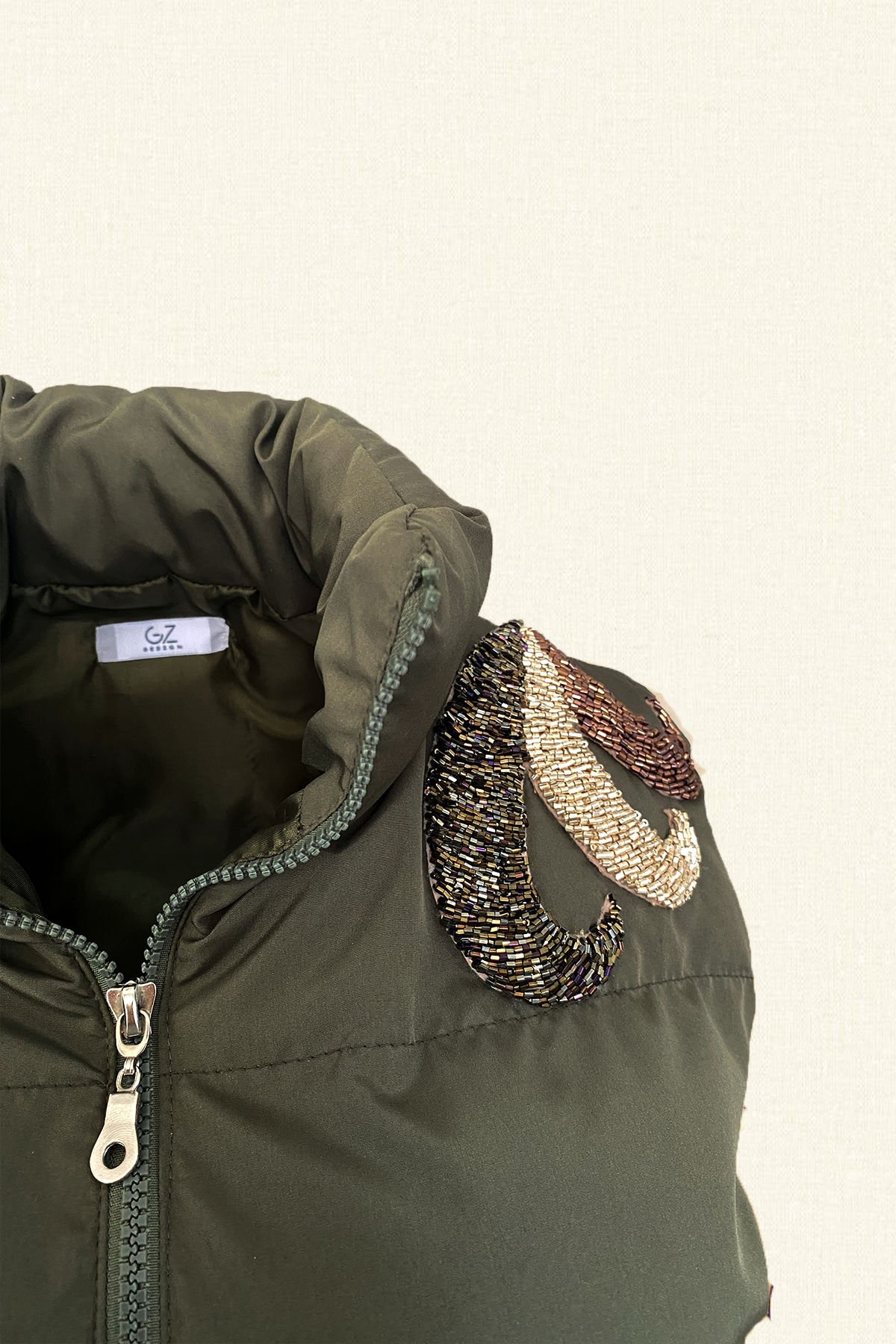 3 renkli kristal boncuk ve taş işlemeli yeşil şişme yelek.