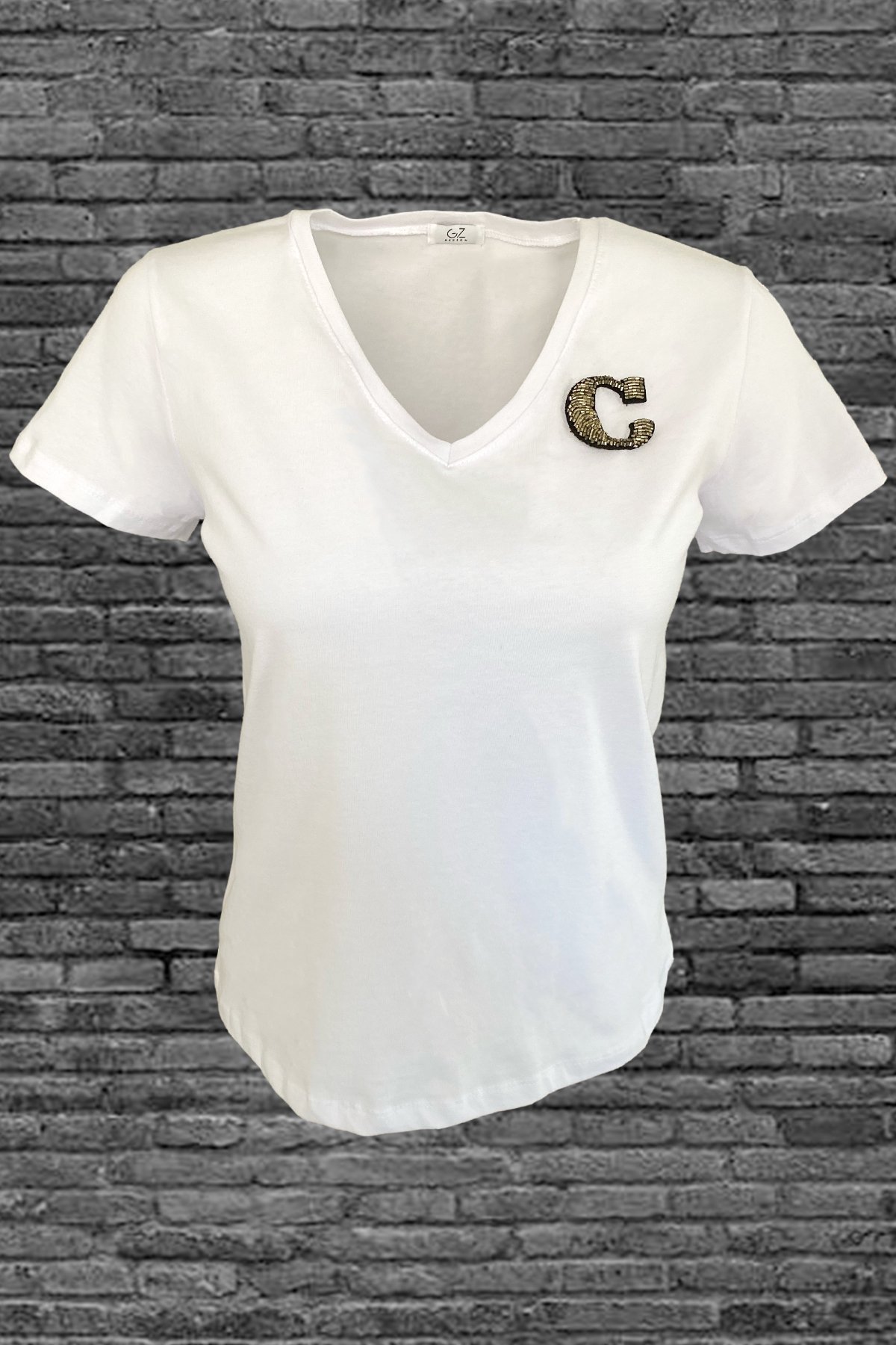 Yaka kısmında gümüş boncuklardan harf işlemesi bulunan, V yaka beyaz tişört.