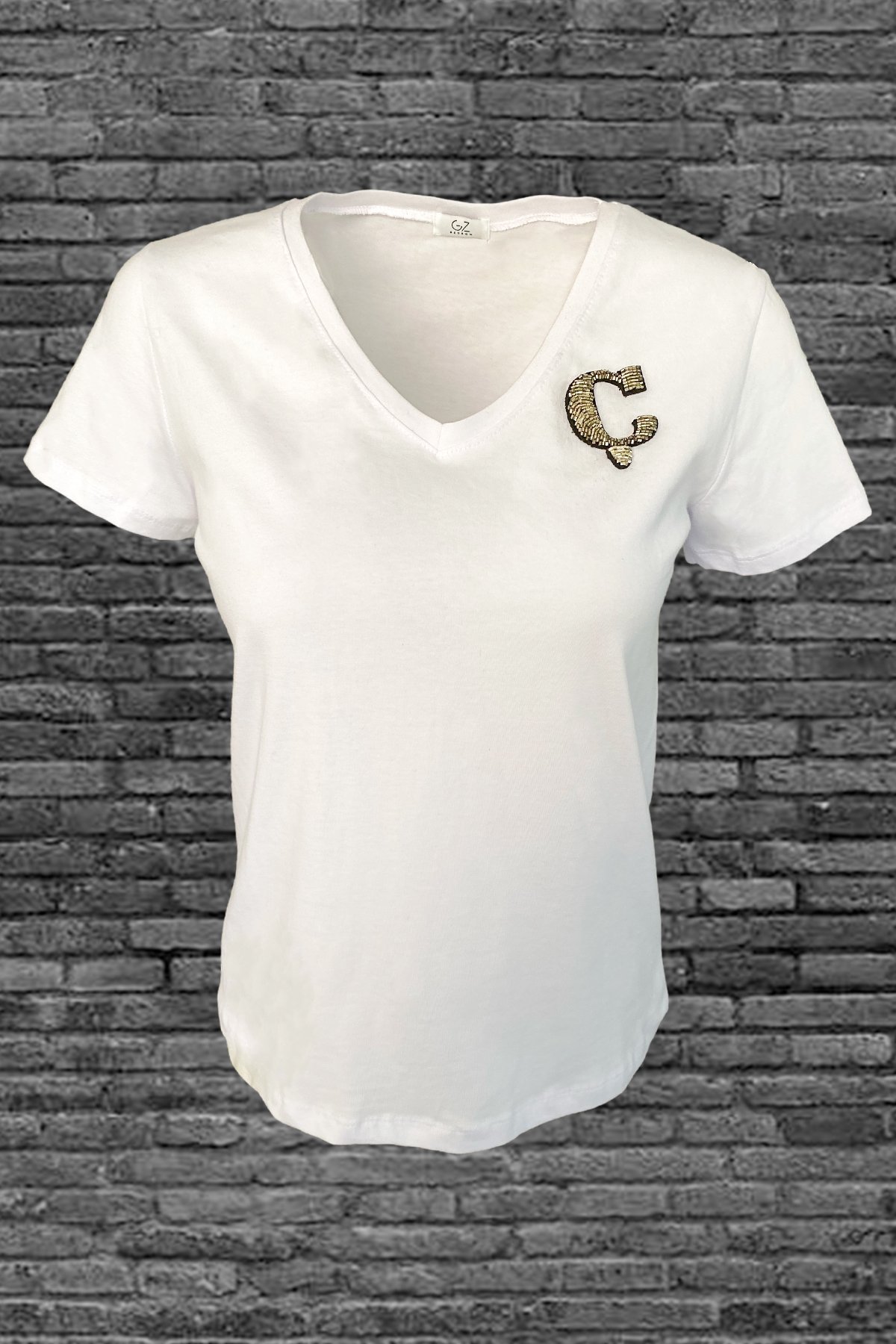 Yaka kısmında gümüş boncuklardan harf işlemesi bulunan, V yaka beyaz tişört.