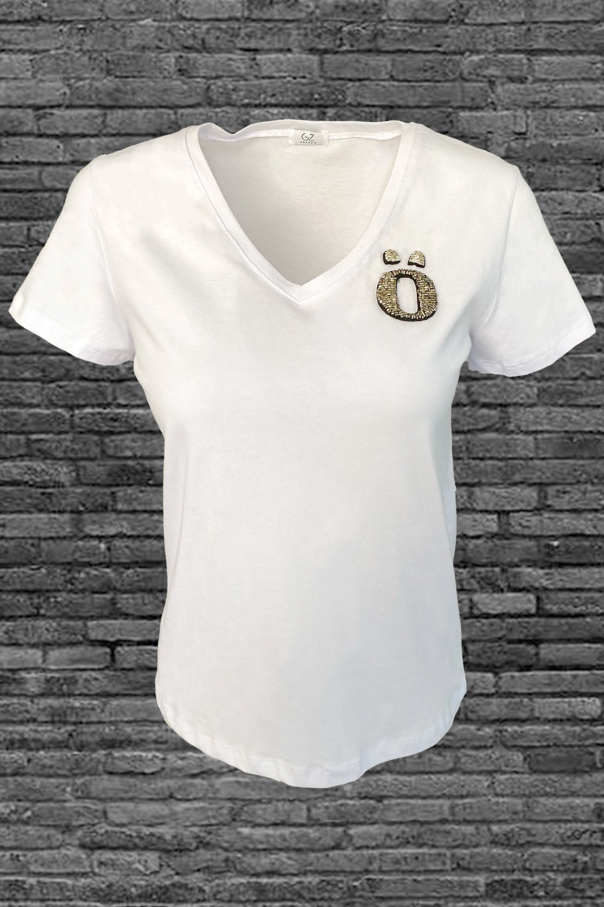 Yaka kısmında gümüş boncuklardan harf işlemesi bulunan, V yaka beyaz tişört.