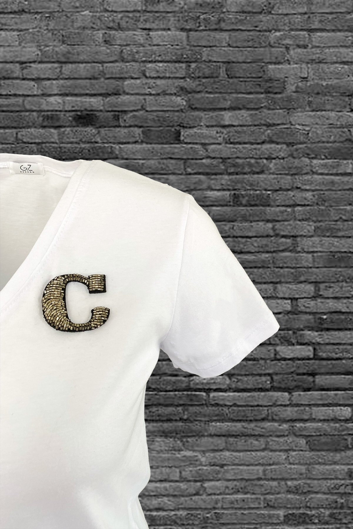 Yaka kısmında gümüş boncuklardan harf işlemesi bulunan, V yaka beyaz tişört.