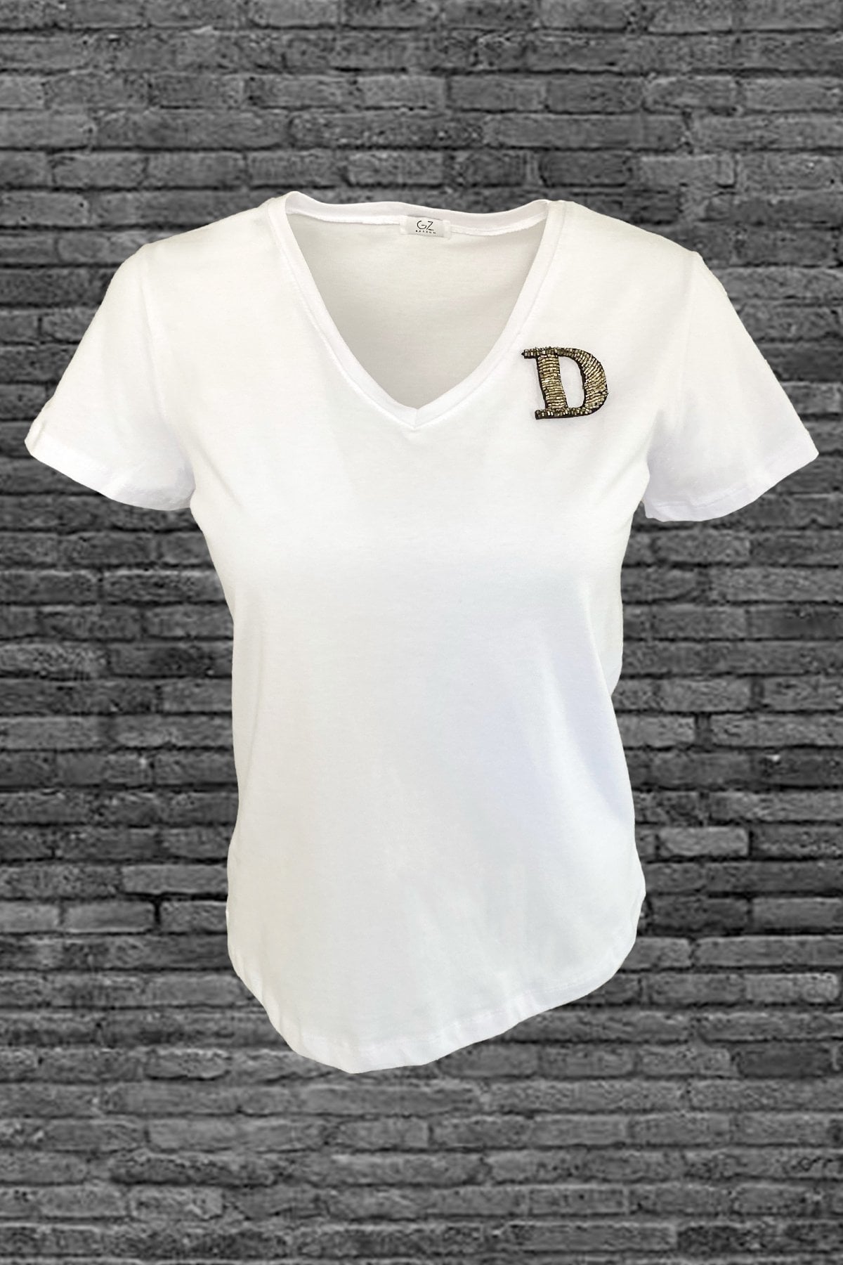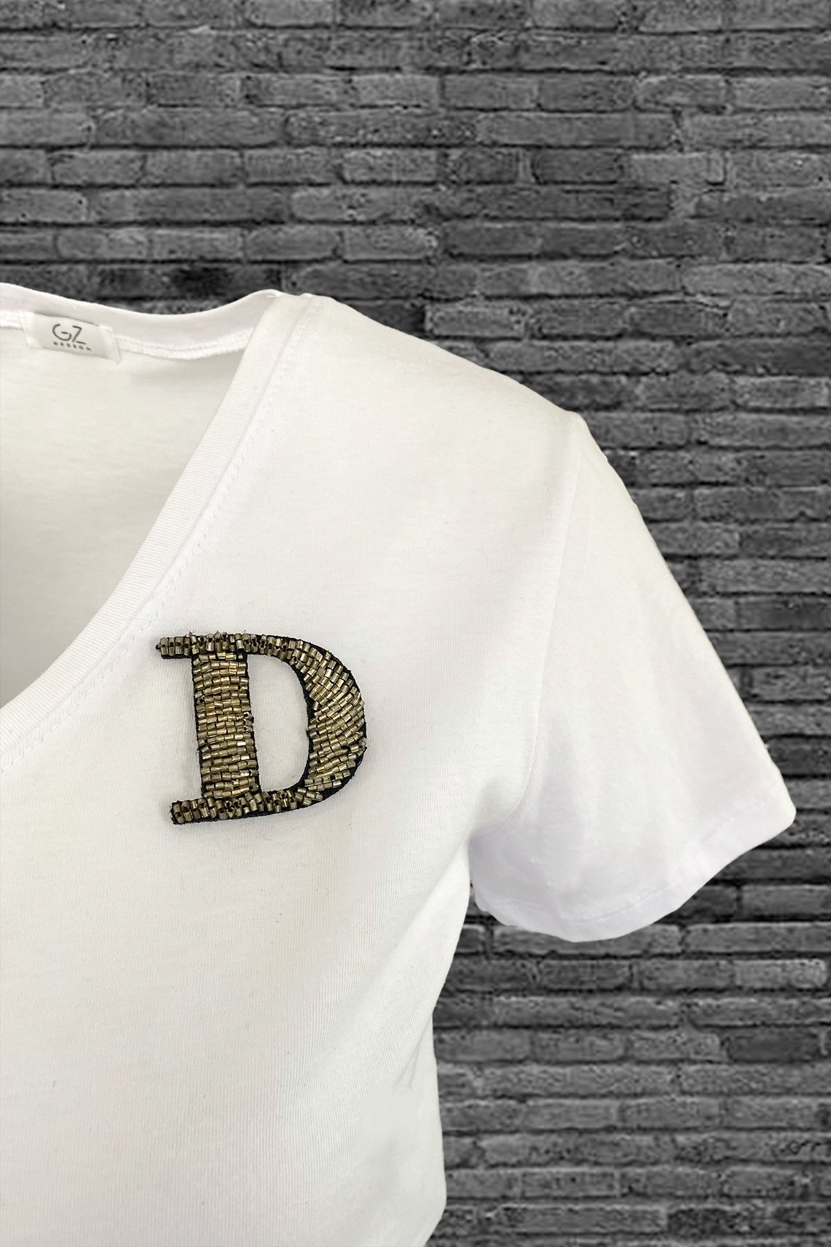 Yaka kısmında gümüş boncuklardan harf işlemesi bulunan, V yaka beyaz tişört.