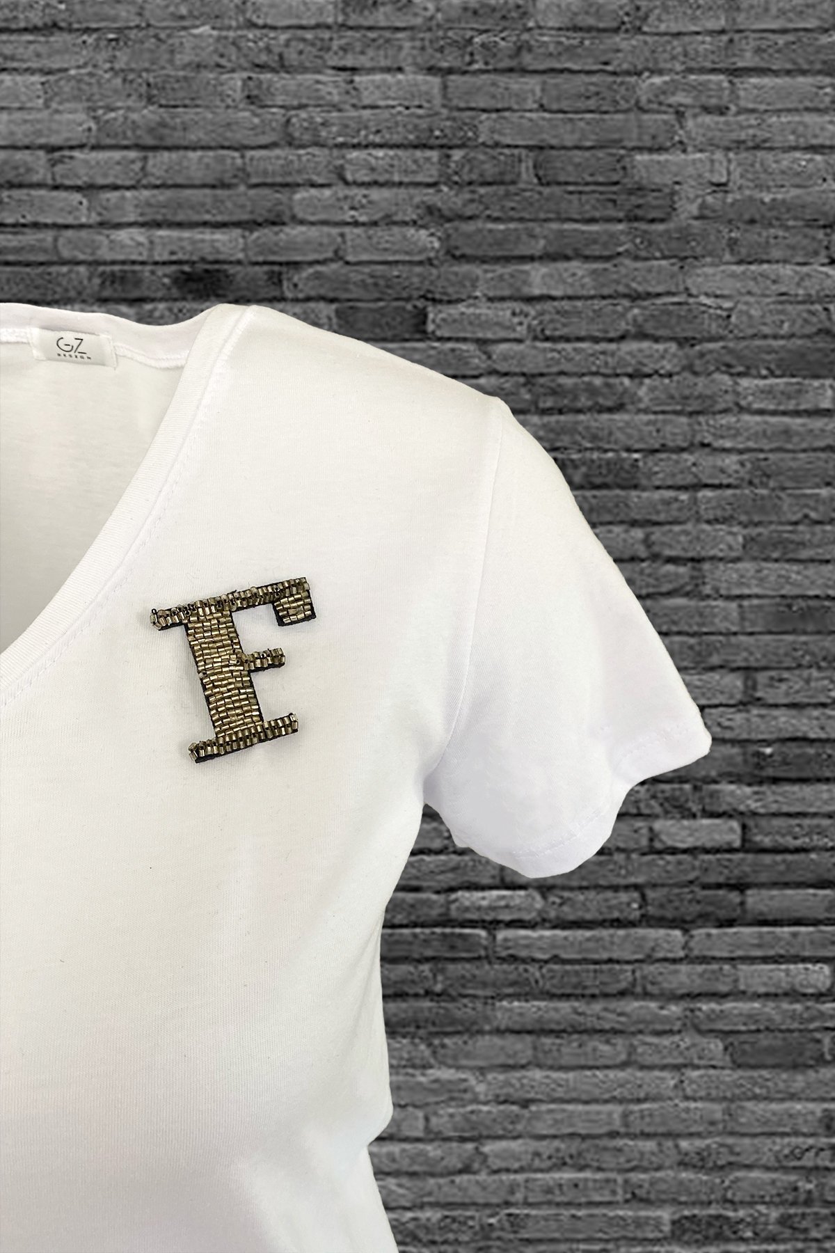 Yaka kısmında gümüş boncuklardan harf işlemesi bulunan, V yaka beyaz tişört.