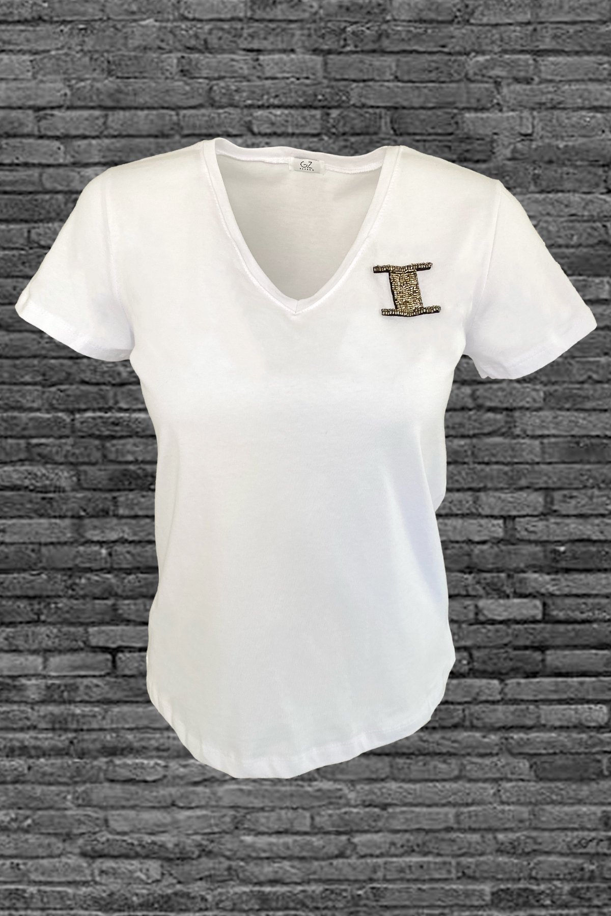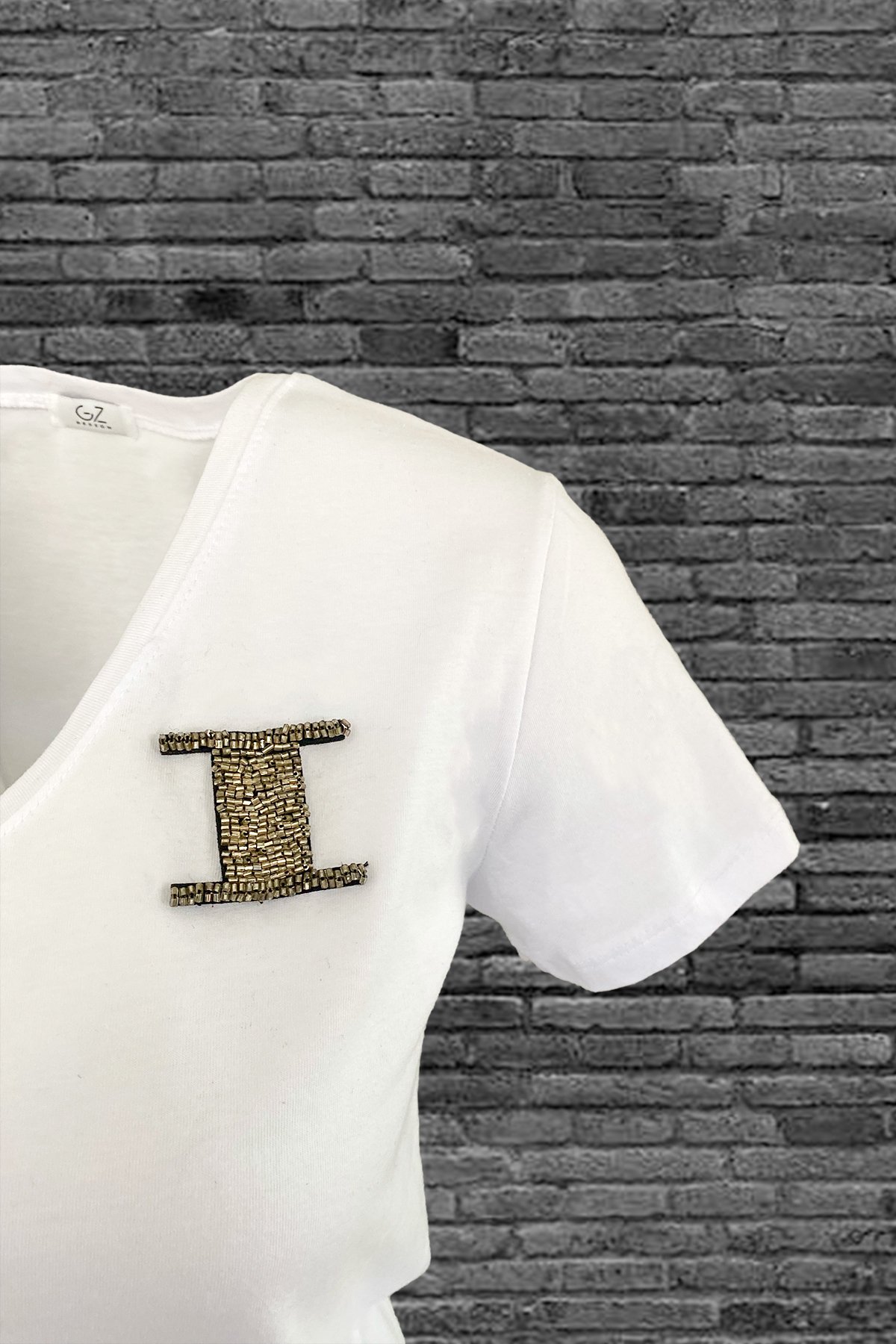 Yaka kısmında gümüş boncuklardan harf işlemesi bulunan, V yaka beyaz tişört.