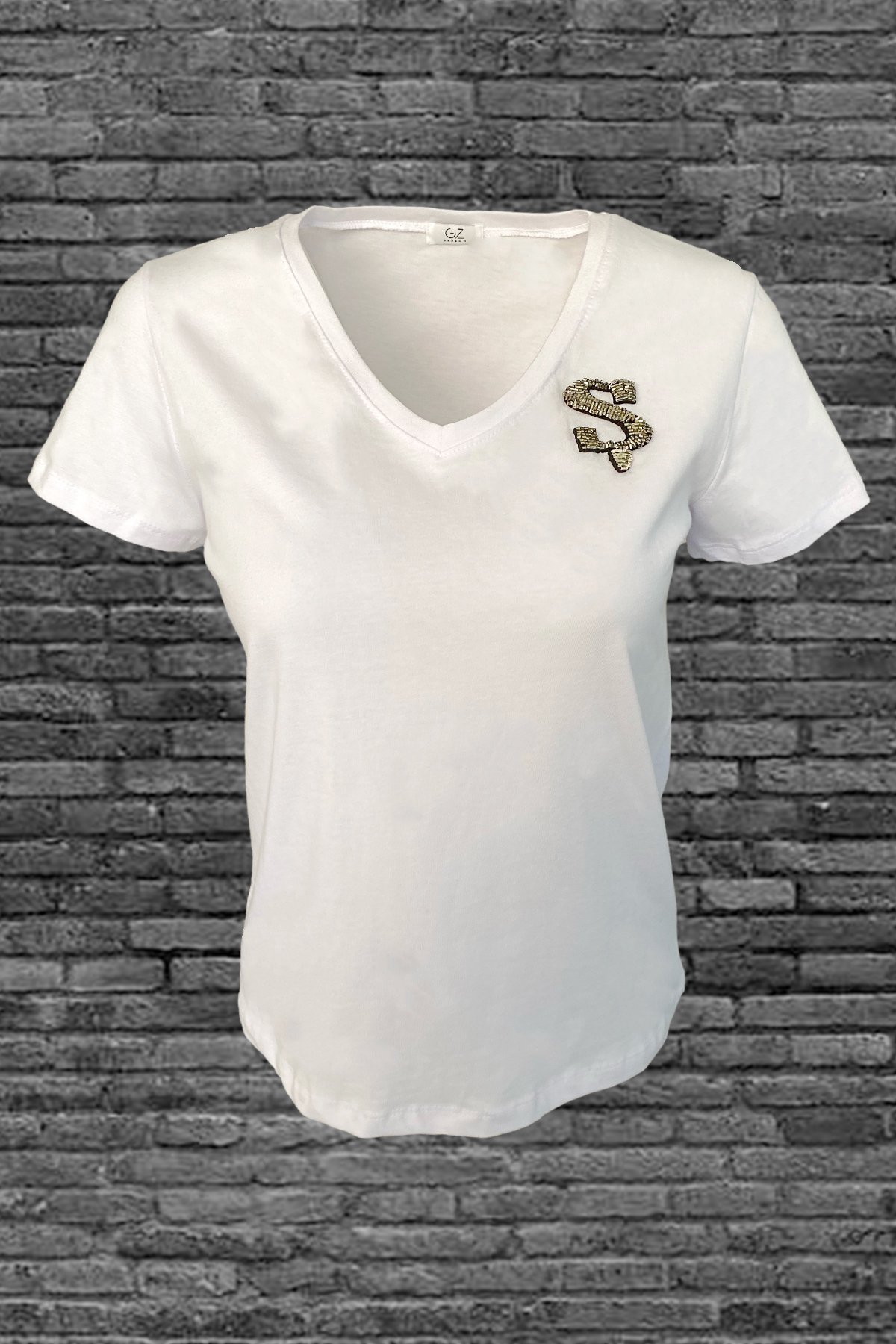 Yaka kısmında gümüş boncuklardan harf işlemesi bulunan, V yaka beyaz tişört.