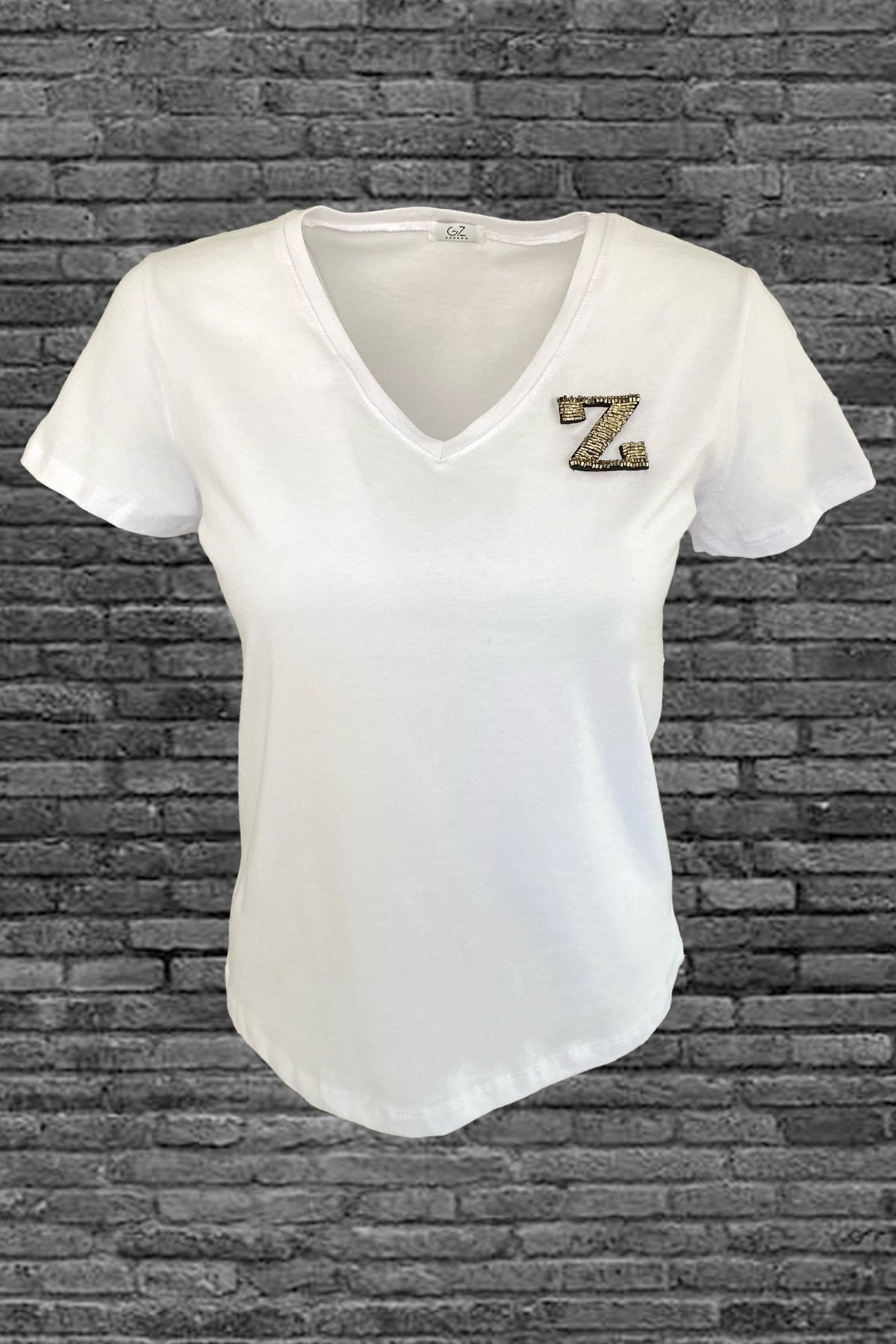 Gümüş Harf İşlemeli V-Yaka Beyaz Tişört M - Z