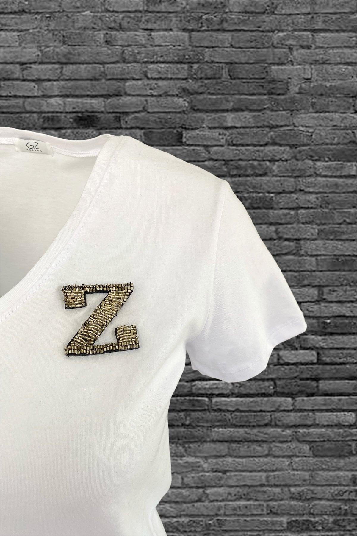 Yaka kısmında gümüş boncuklardan harf işlemesi bulunan, V yaka beyaz tişört.