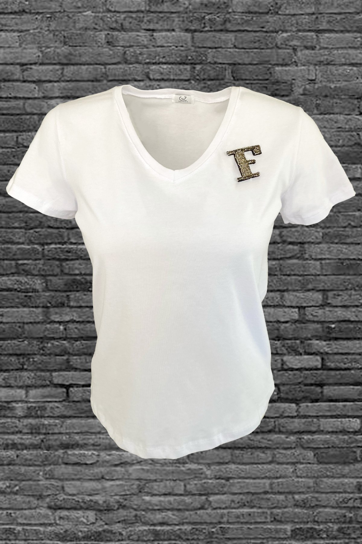 Yaka kısmında gümüş boncuklardan harf işlemesi bulunan, V yaka beyaz tişört.