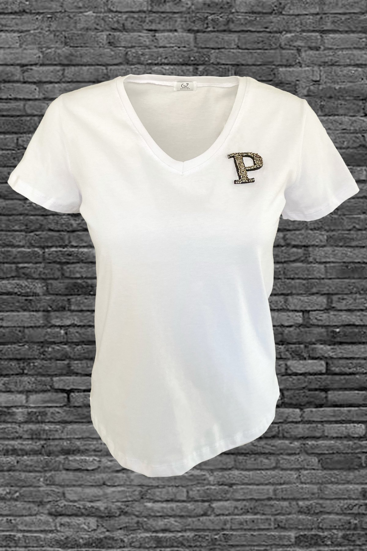 Yaka kısmında gümüş boncuklardan harf işlemesi bulunan, V yaka beyaz tişört.