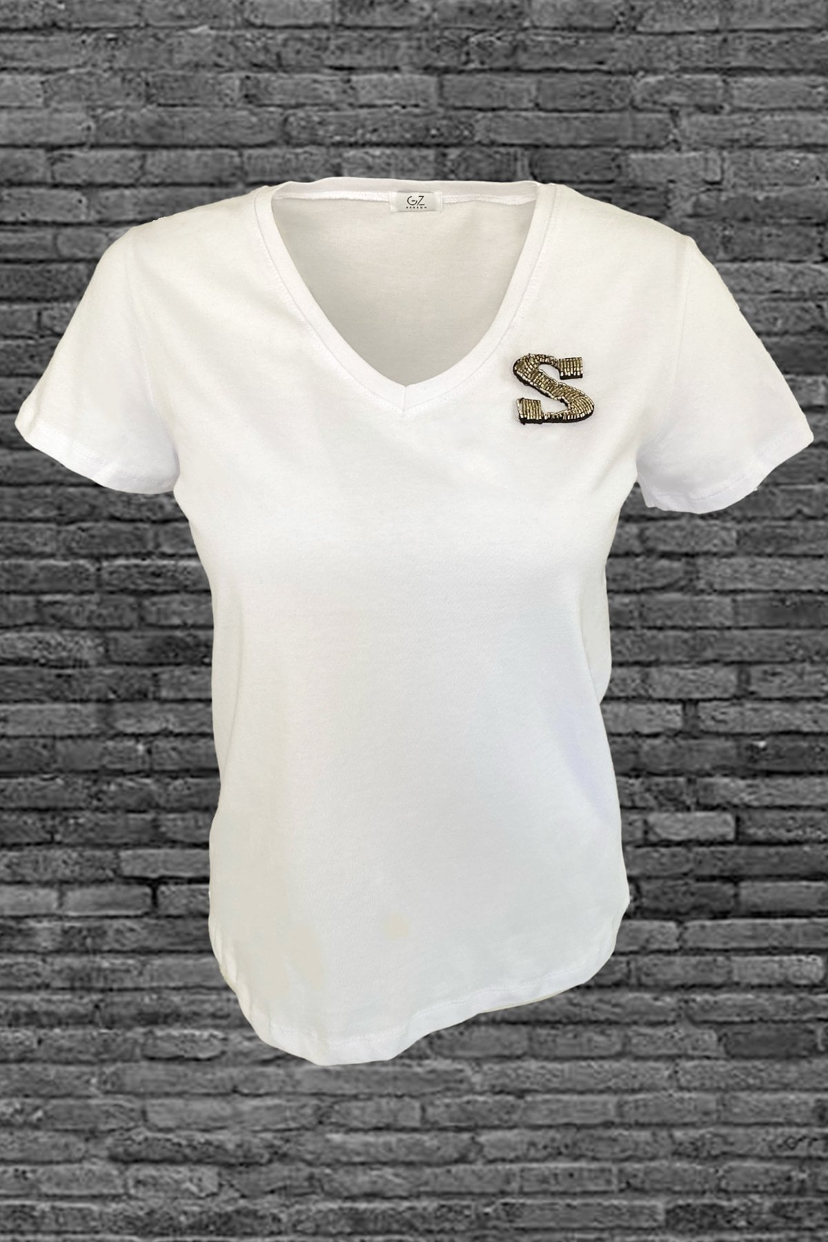 Yaka kısmında gümüş boncuklardan harf işlemesi bulunan, V yaka beyaz tişört.