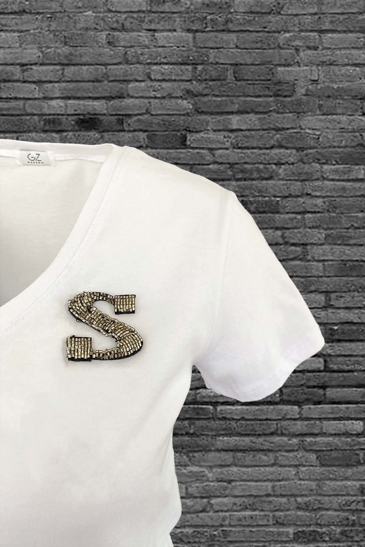 Yaka kısmında gümüş boncuklardan harf işlemesi bulunan, V yaka beyaz tişört.