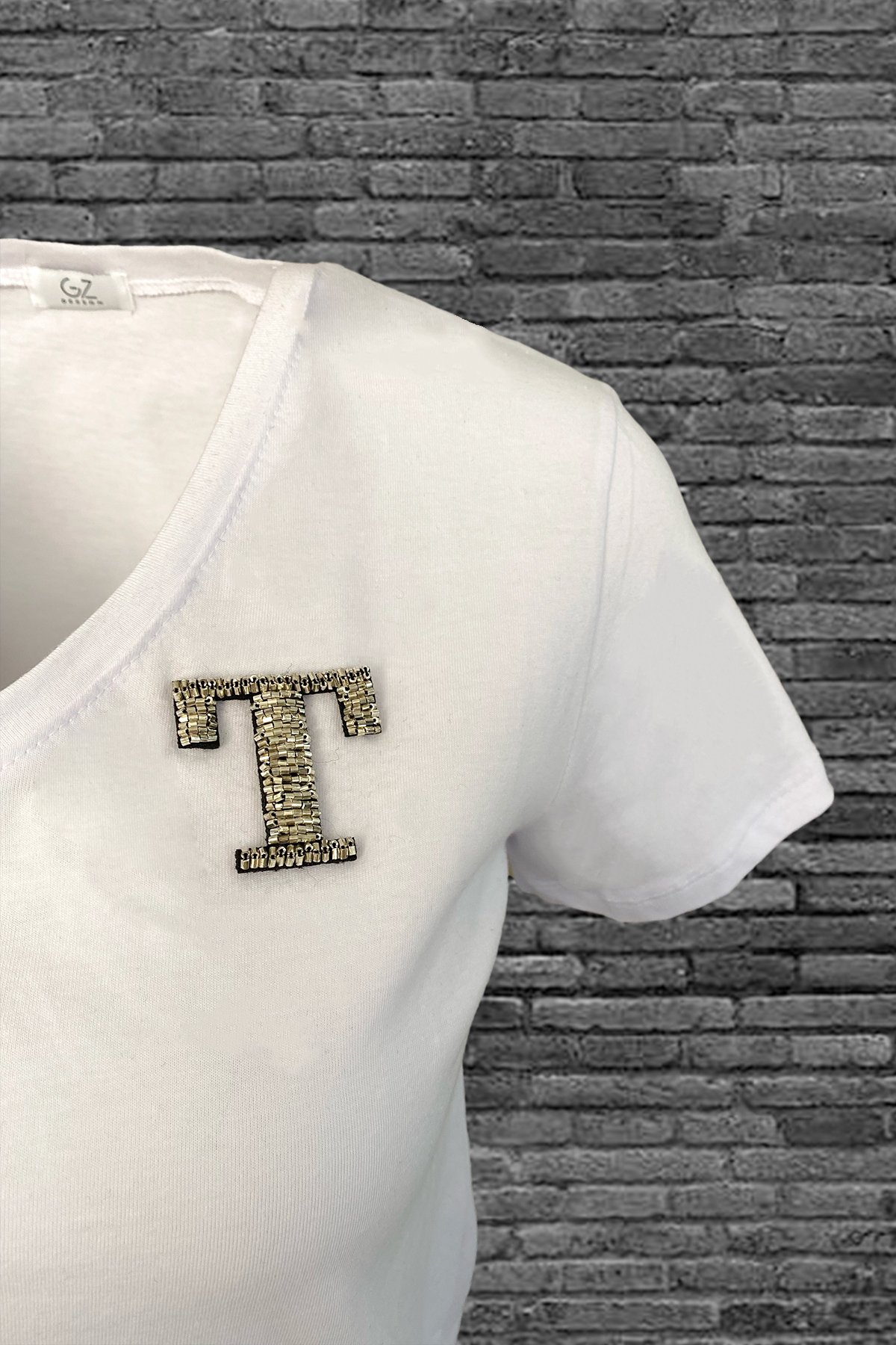 Yaka kısmında gümüş boncuklardan harf işlemesi bulunan, V yaka beyaz tişört.