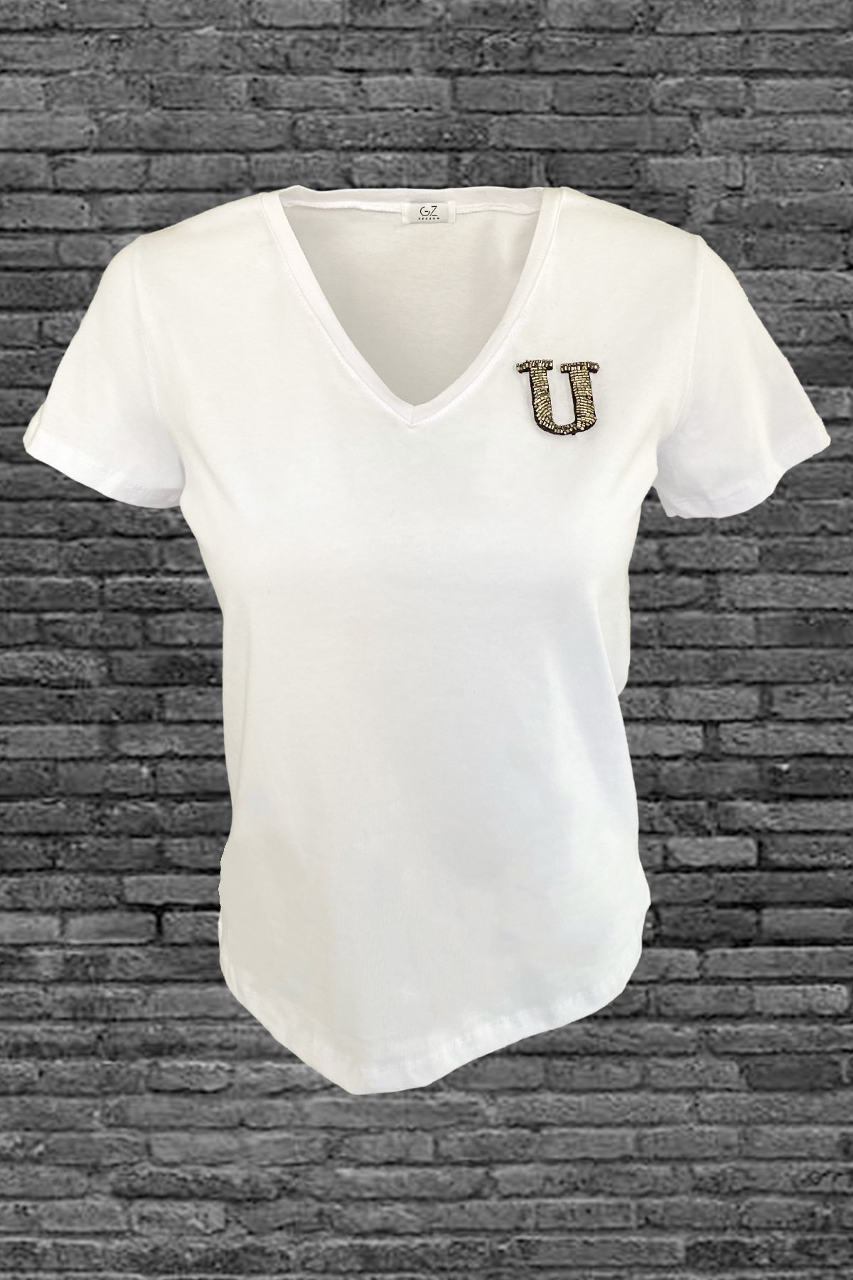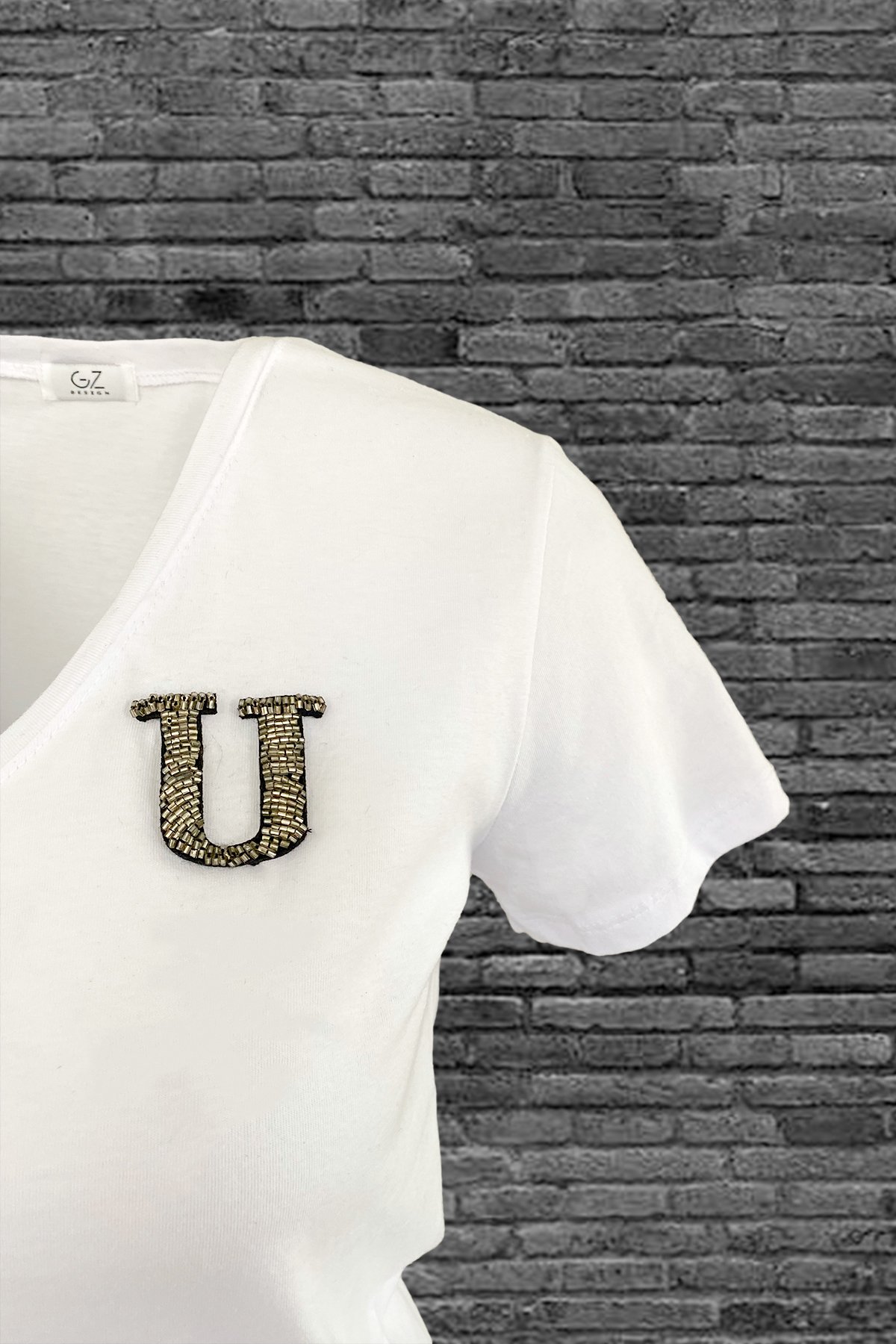 Yaka kısmında gümüş boncuklardan harf işlemesi bulunan, V yaka beyaz tişört.