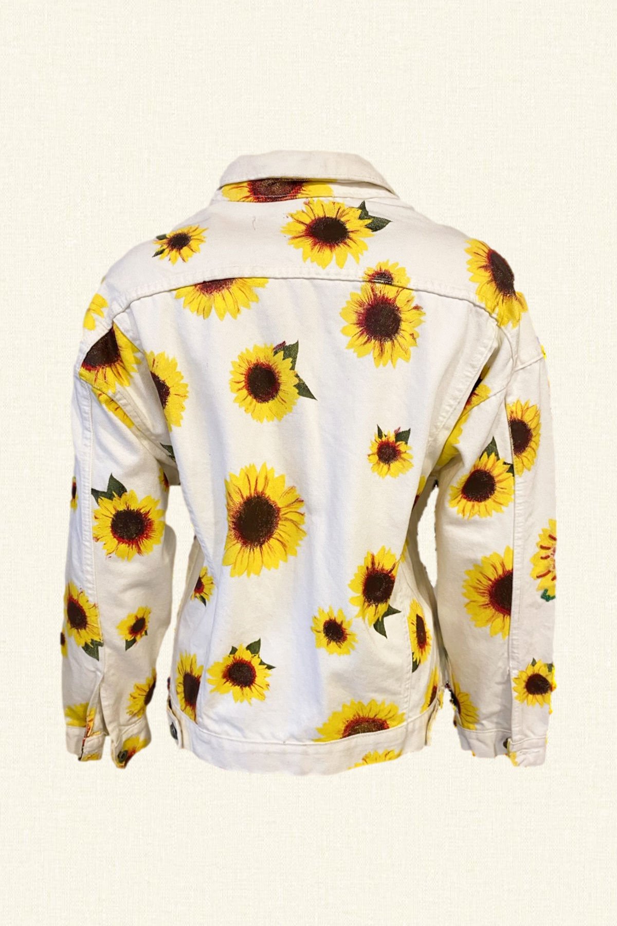 Ayçiçek Figürlü El Boyaması Beyaz Oversize Jean Ceket