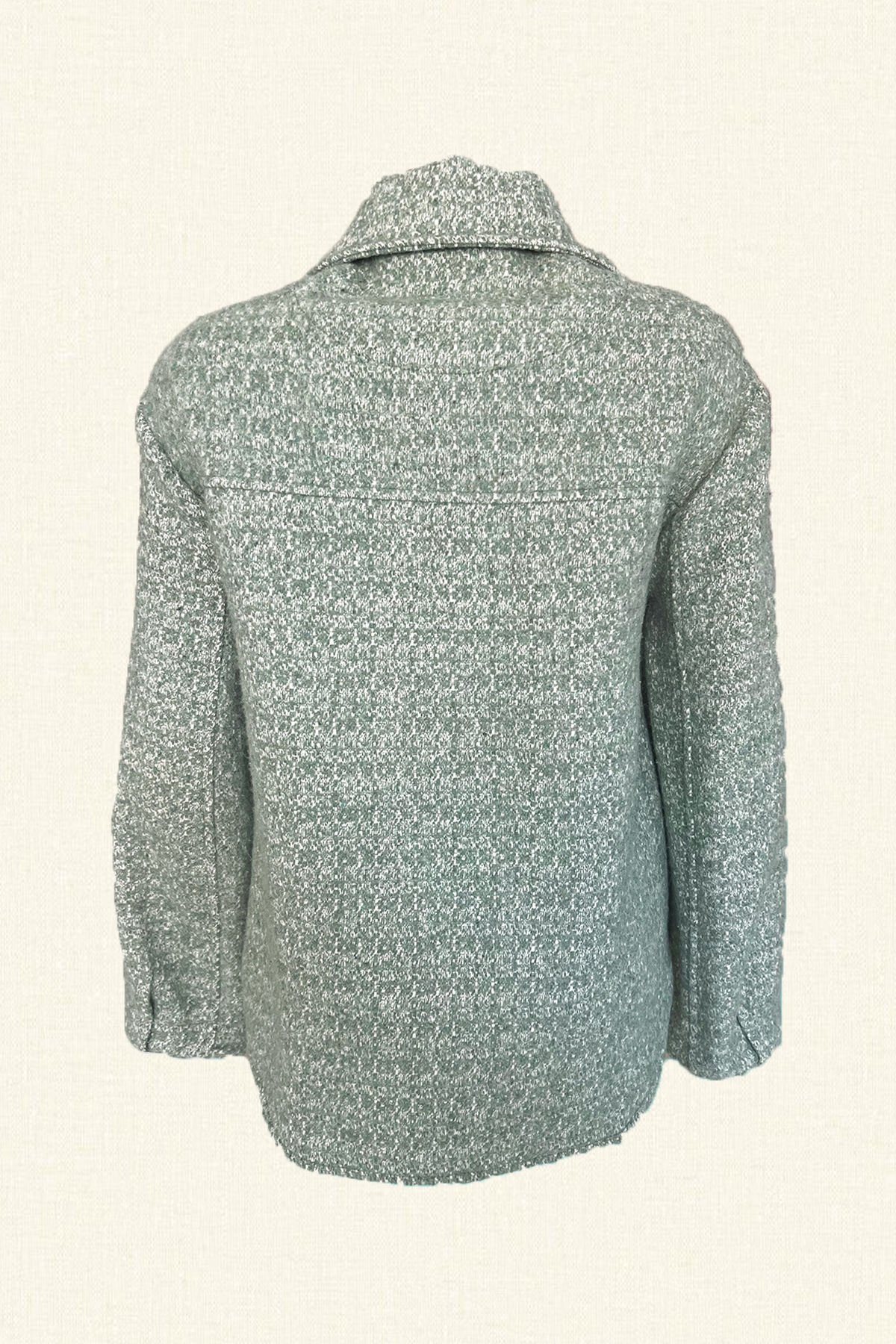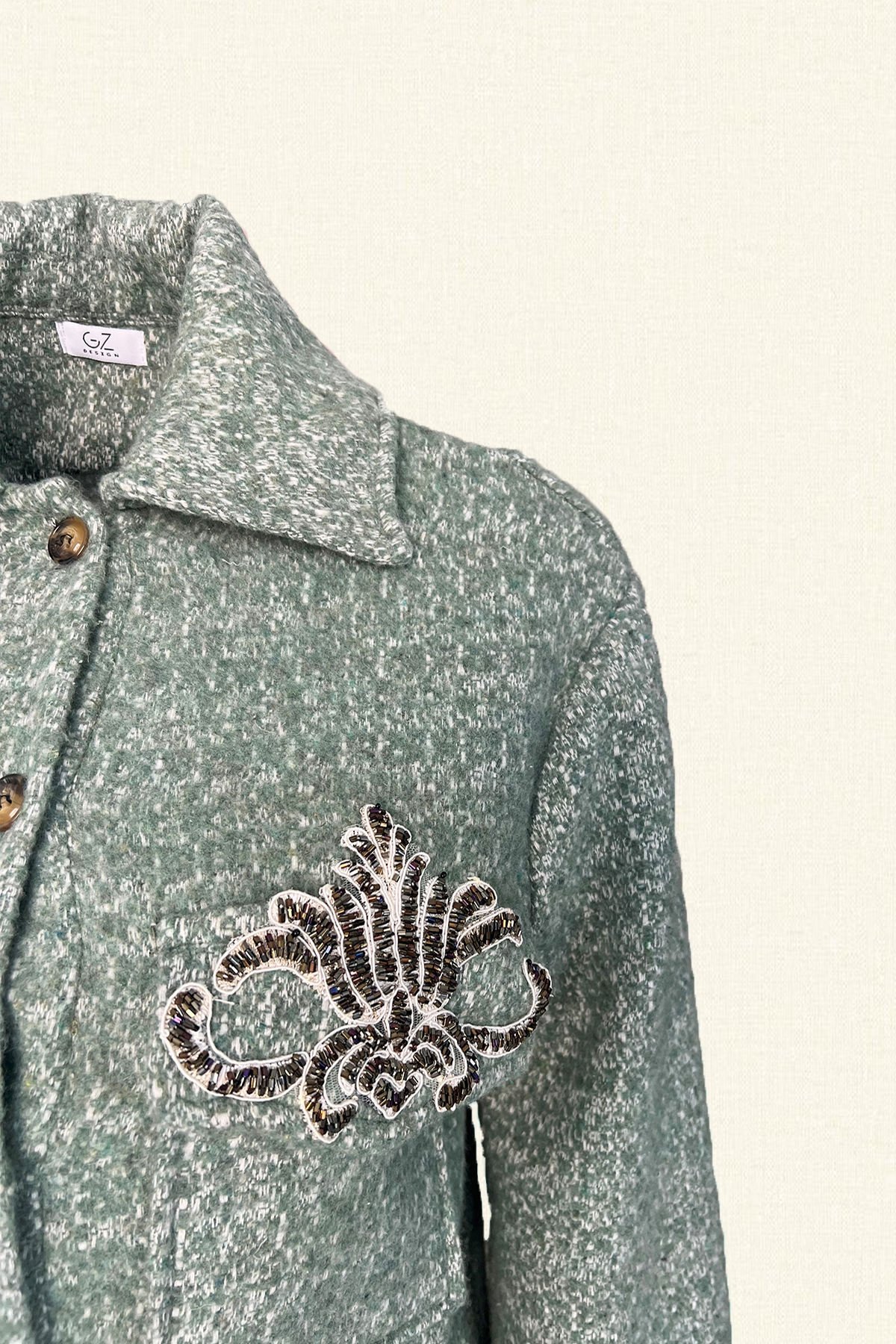 Cep kısımlarında boncuklardan bakır işlemesi bulunan, kırçıllı, mint yeşili yünlü ceket.