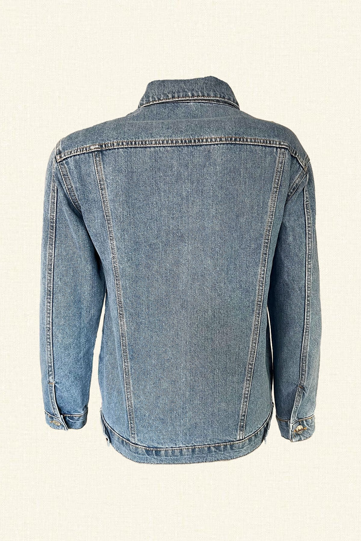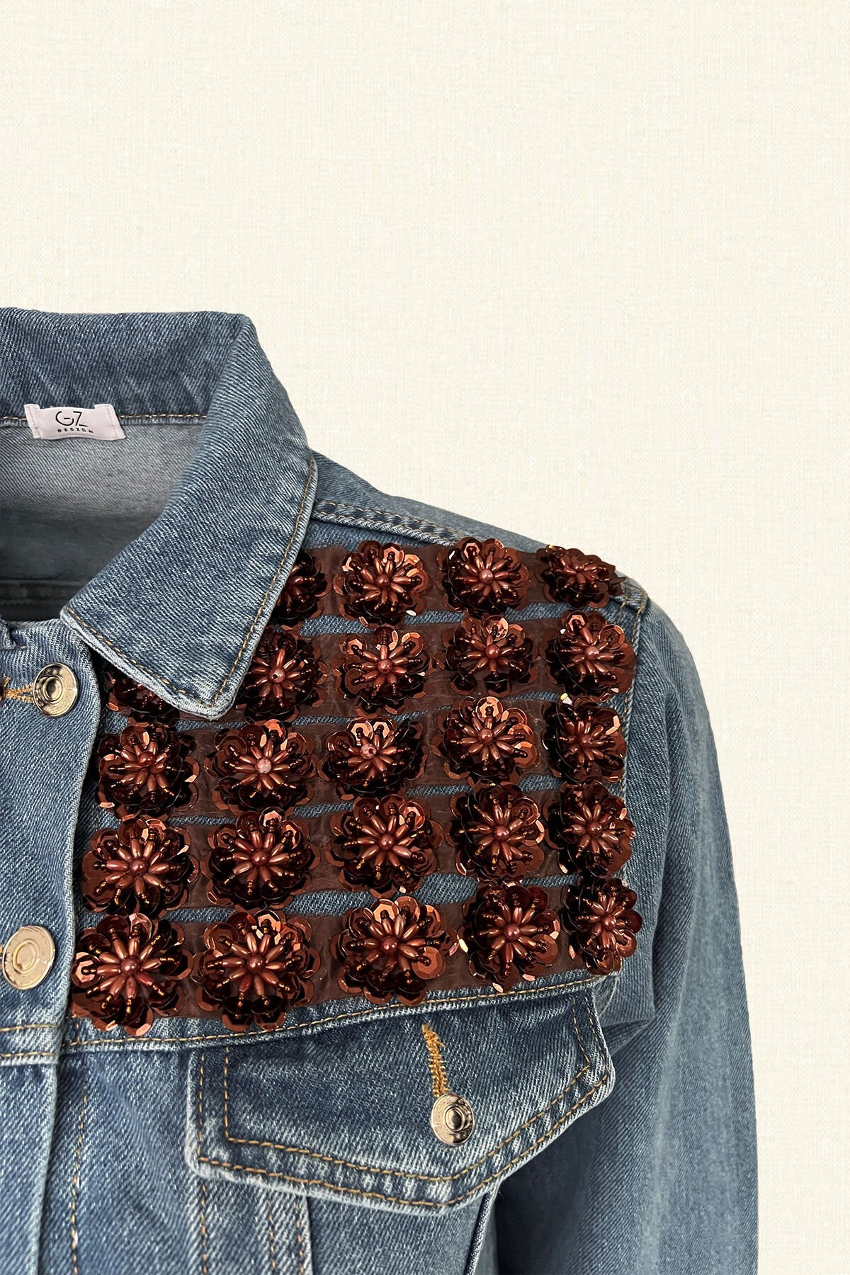 Göğüs kısımlarında bakır tül üzerine boncuk işlemeli çiçekleri bulunan açık renk jean ceket.