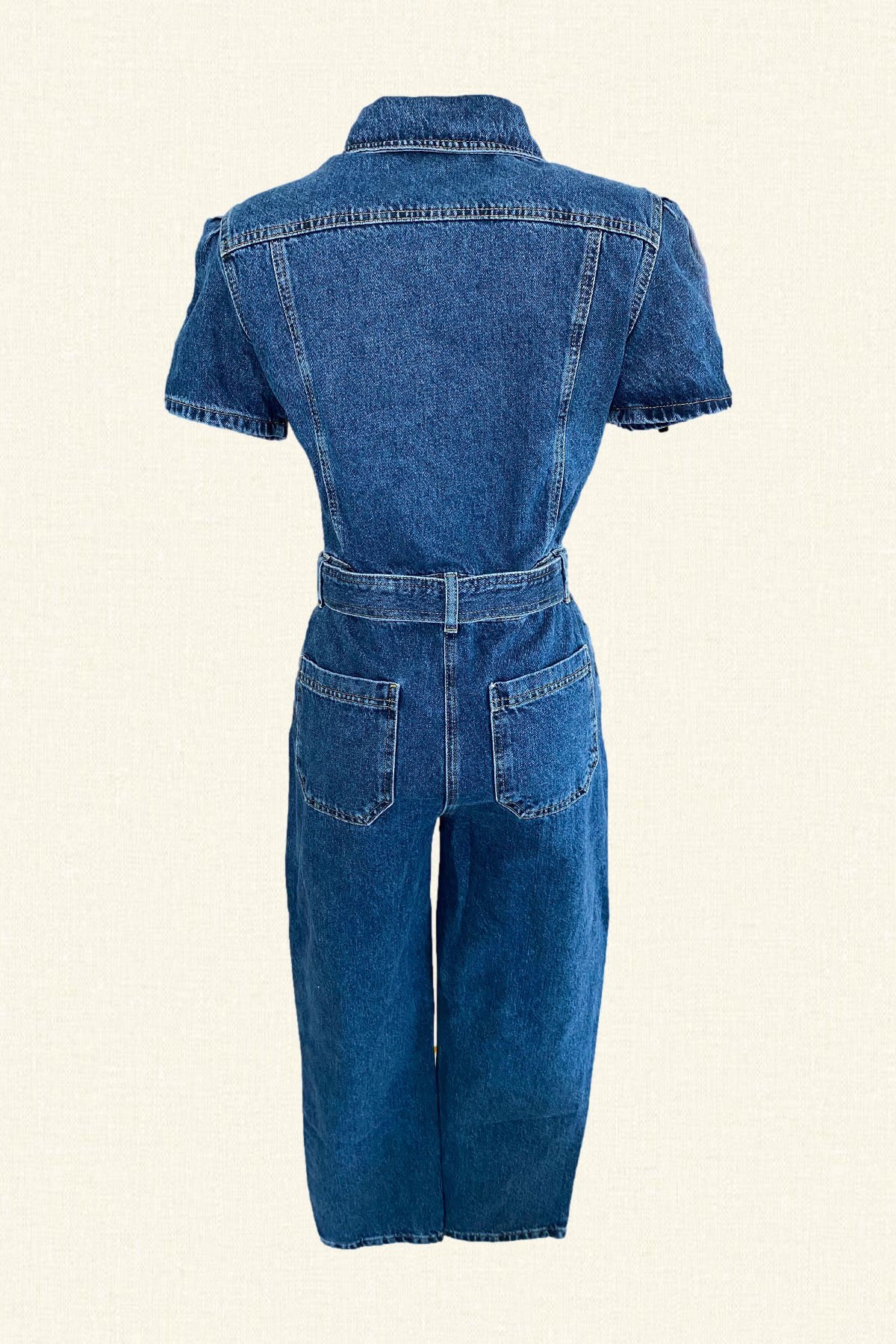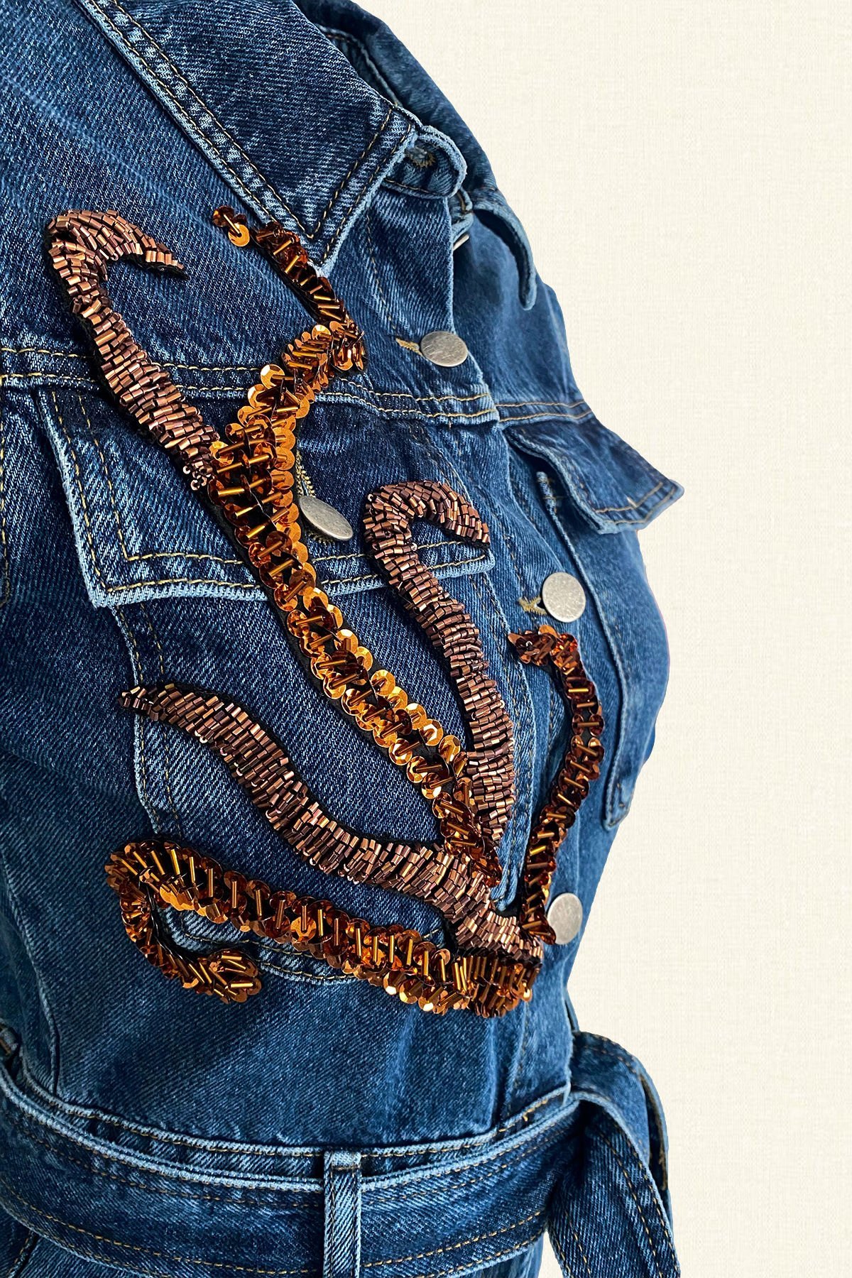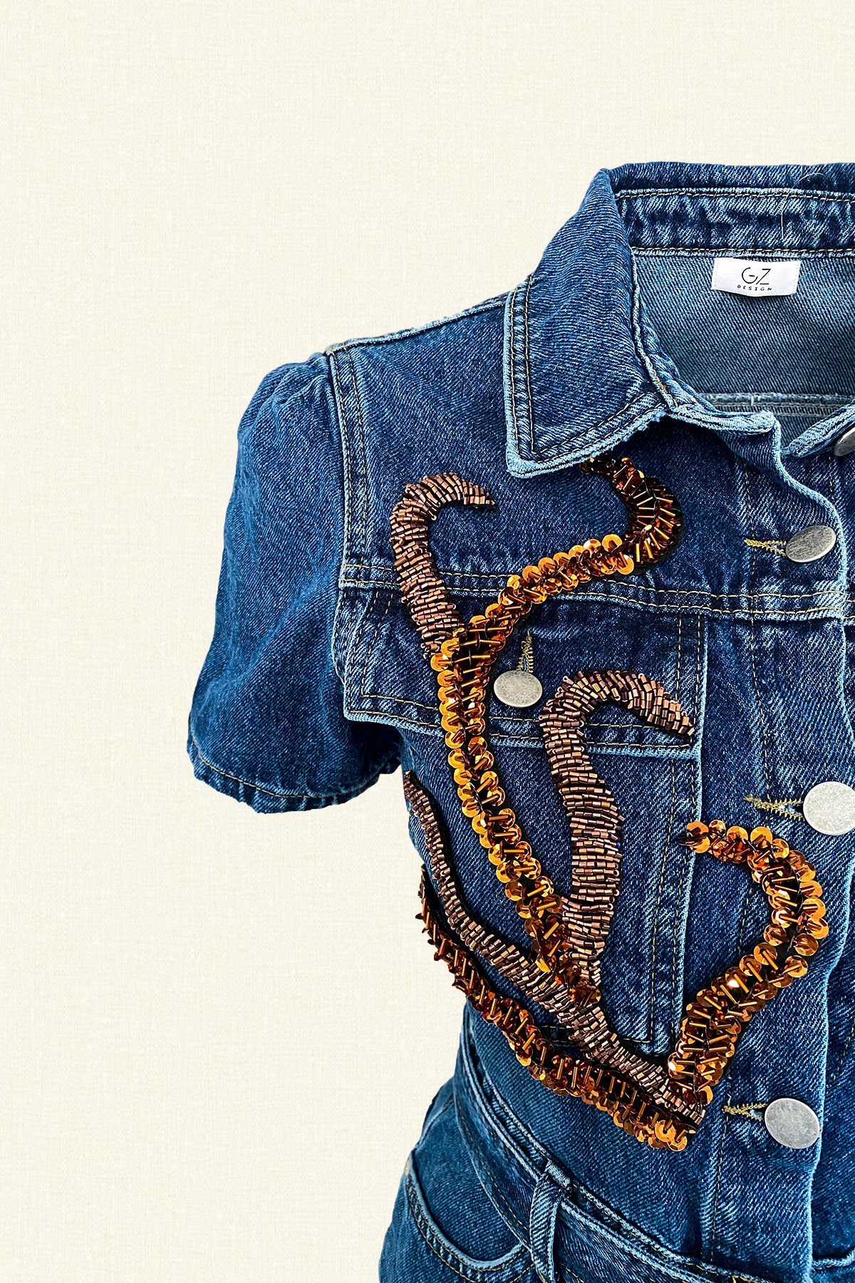 Bakır boncuk ve pullardan dal işlemeli, düğme, fermuar detaylı, kemerli, balon kol tulum.