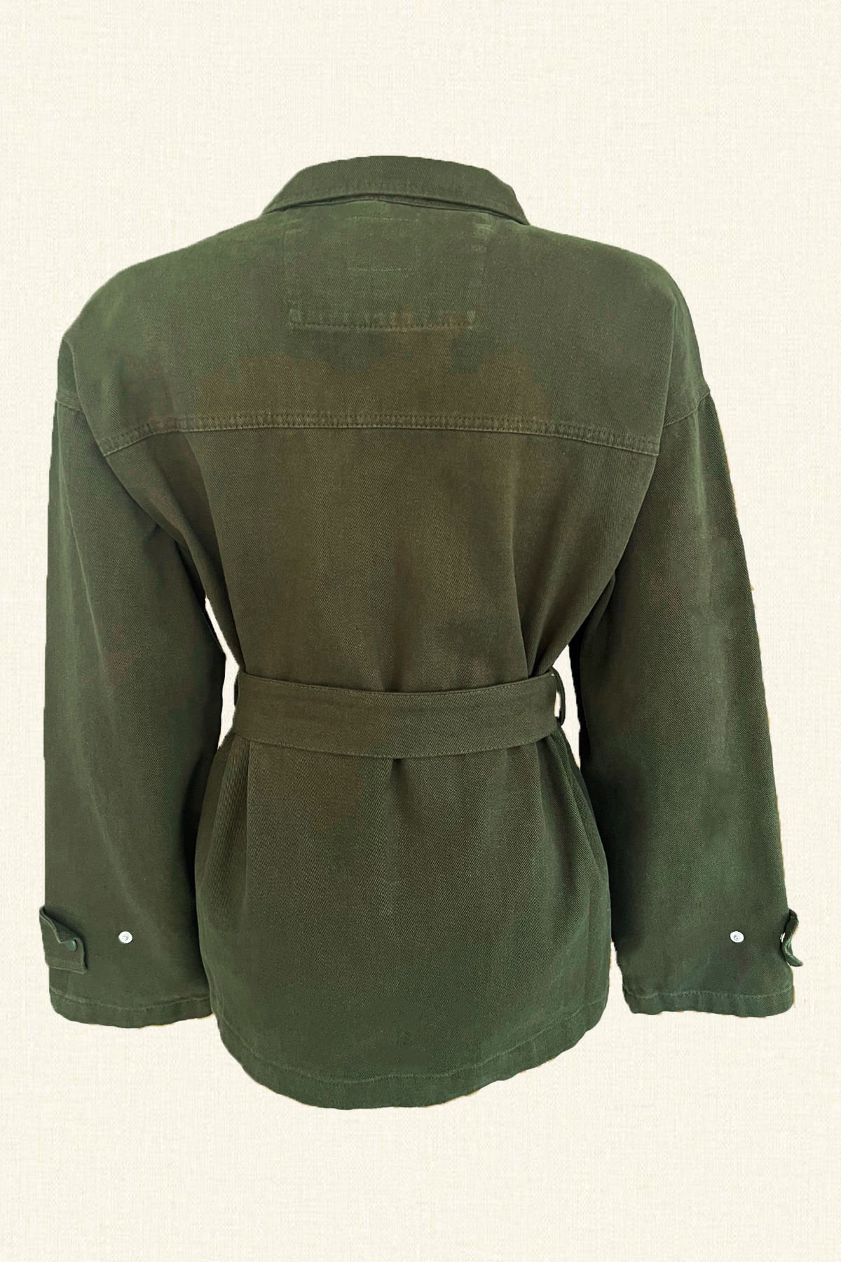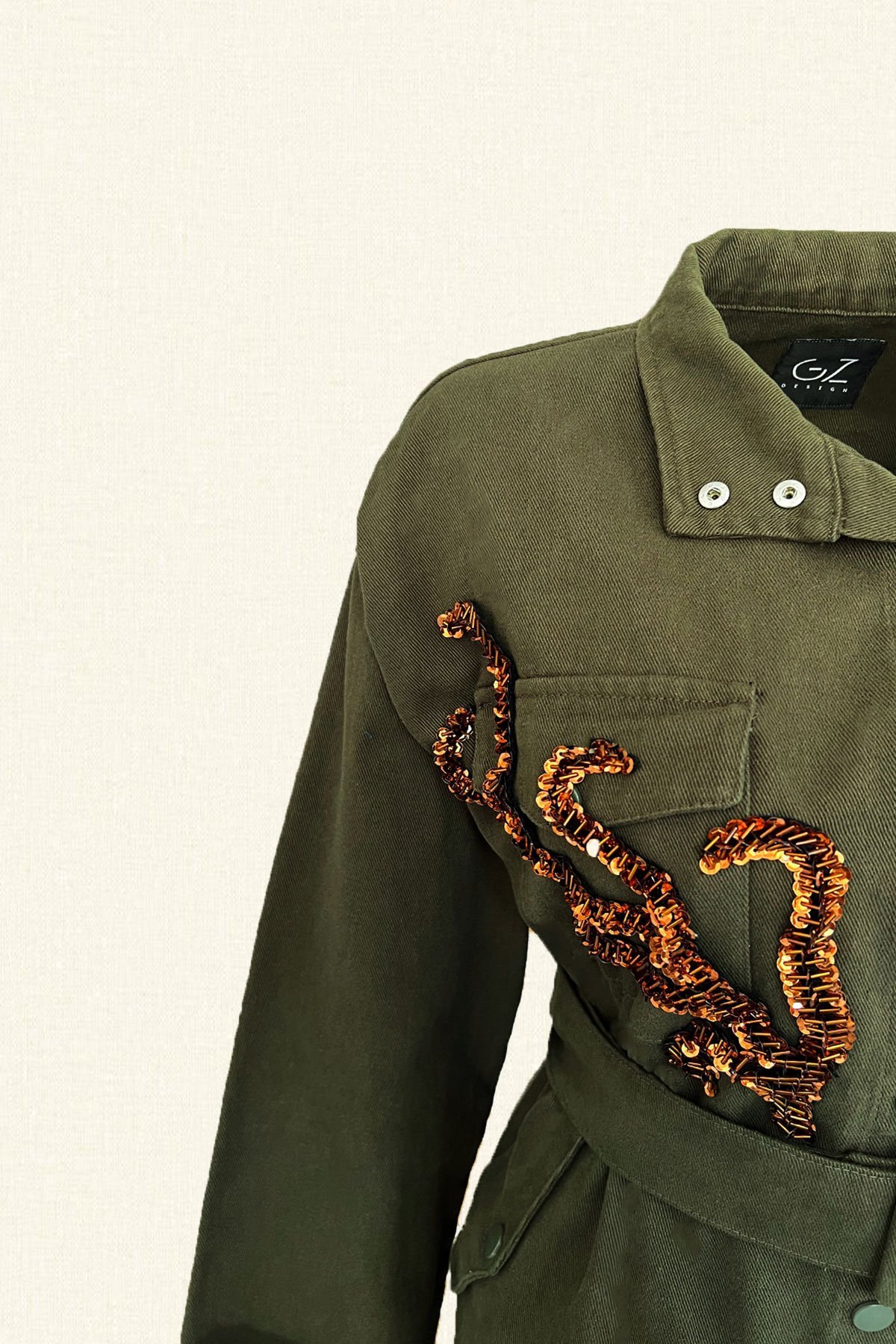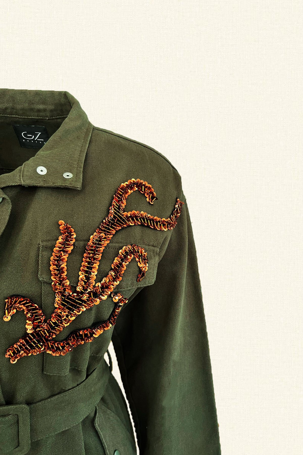 Bakır pul ve boncuklardan dal işlemeli, yeşil renk, kemer detaylı jean ceket.
