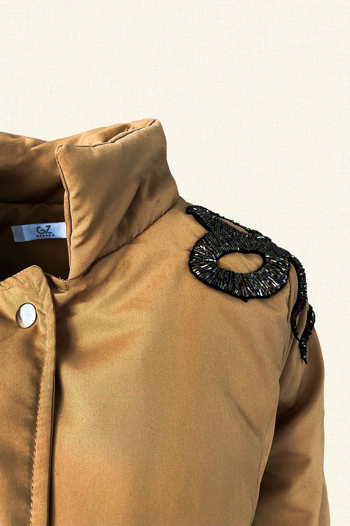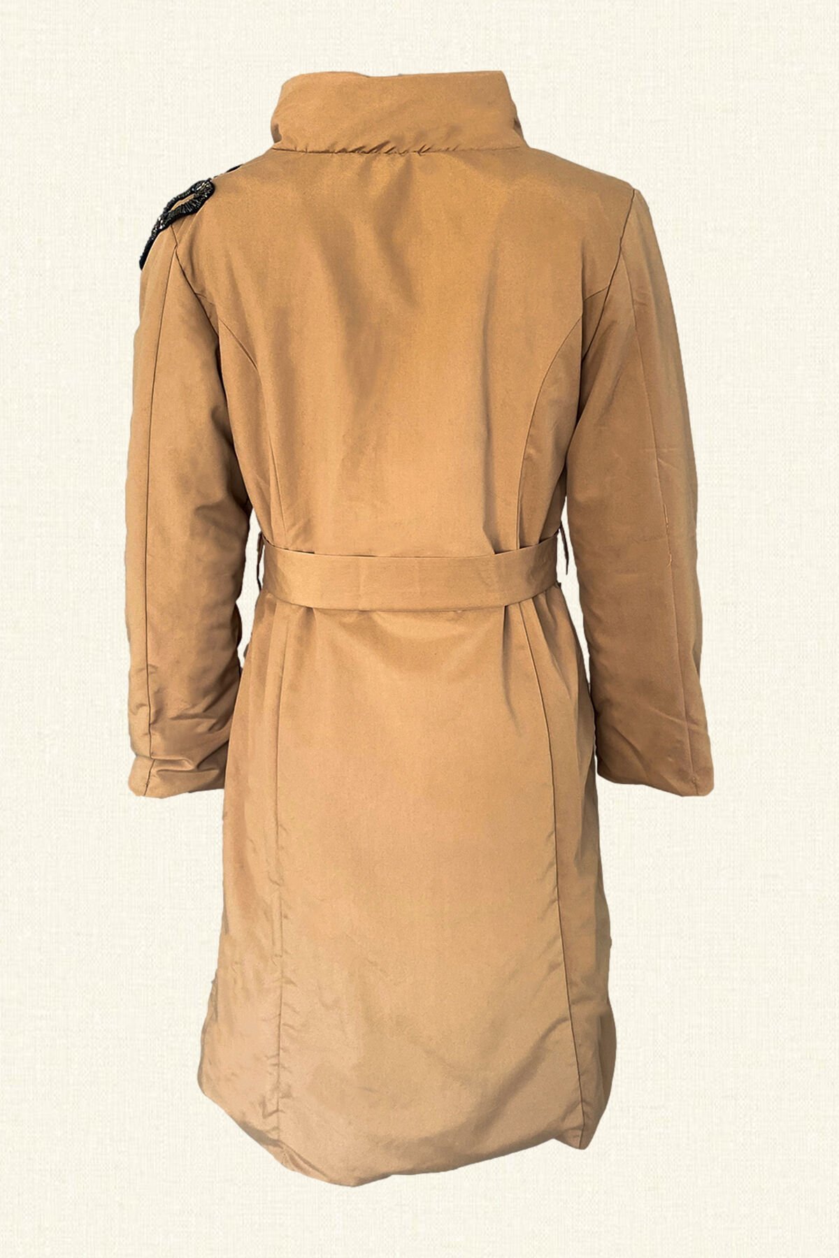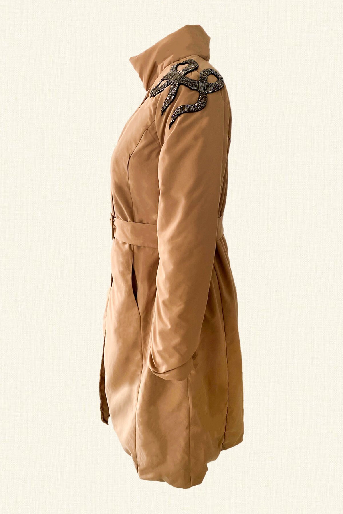 Omuz kısmında bakır boncuklardan halat işlemesi bulunan, kapitone kumaş, beli kemerli ve astar detaylı ince mont.