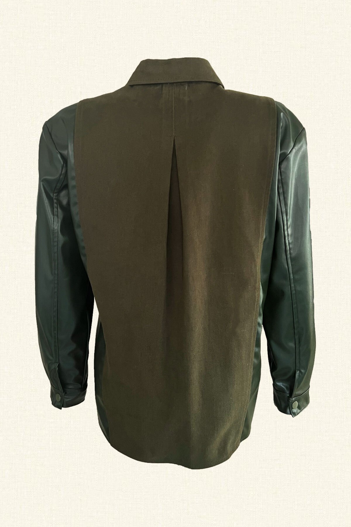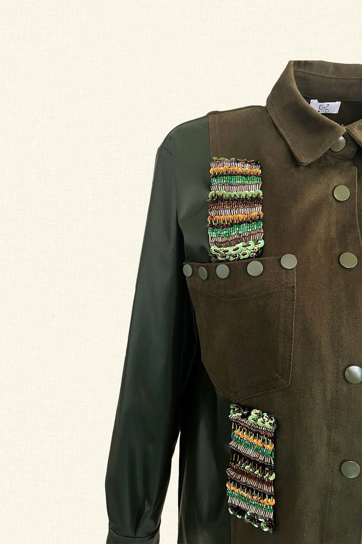 Kolları deri detaylı, cep üstünde ve altında bakır, yeşil boncuk, pullardan işlemesi bulunan yeşil jean ceket.