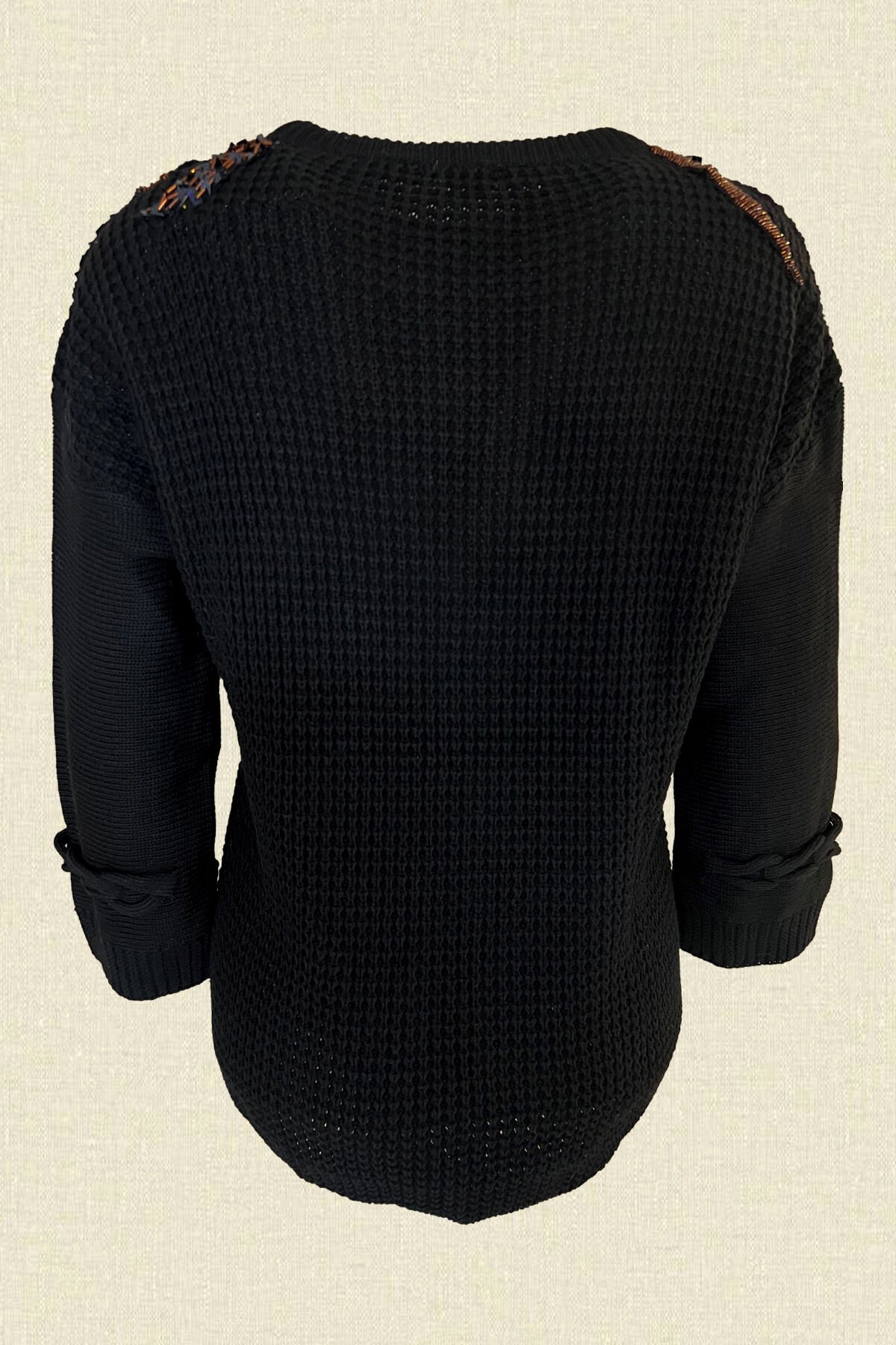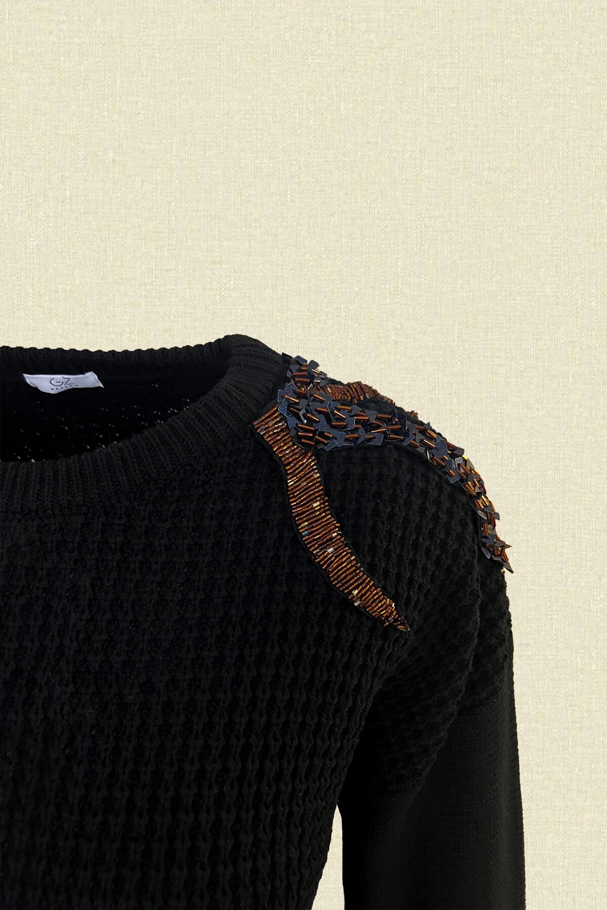 Omuz kısımlarında bakır boncuk ve pullardan işlemesi bulunan, kolları örgü detaylı, örme siyah renk triko kazak.