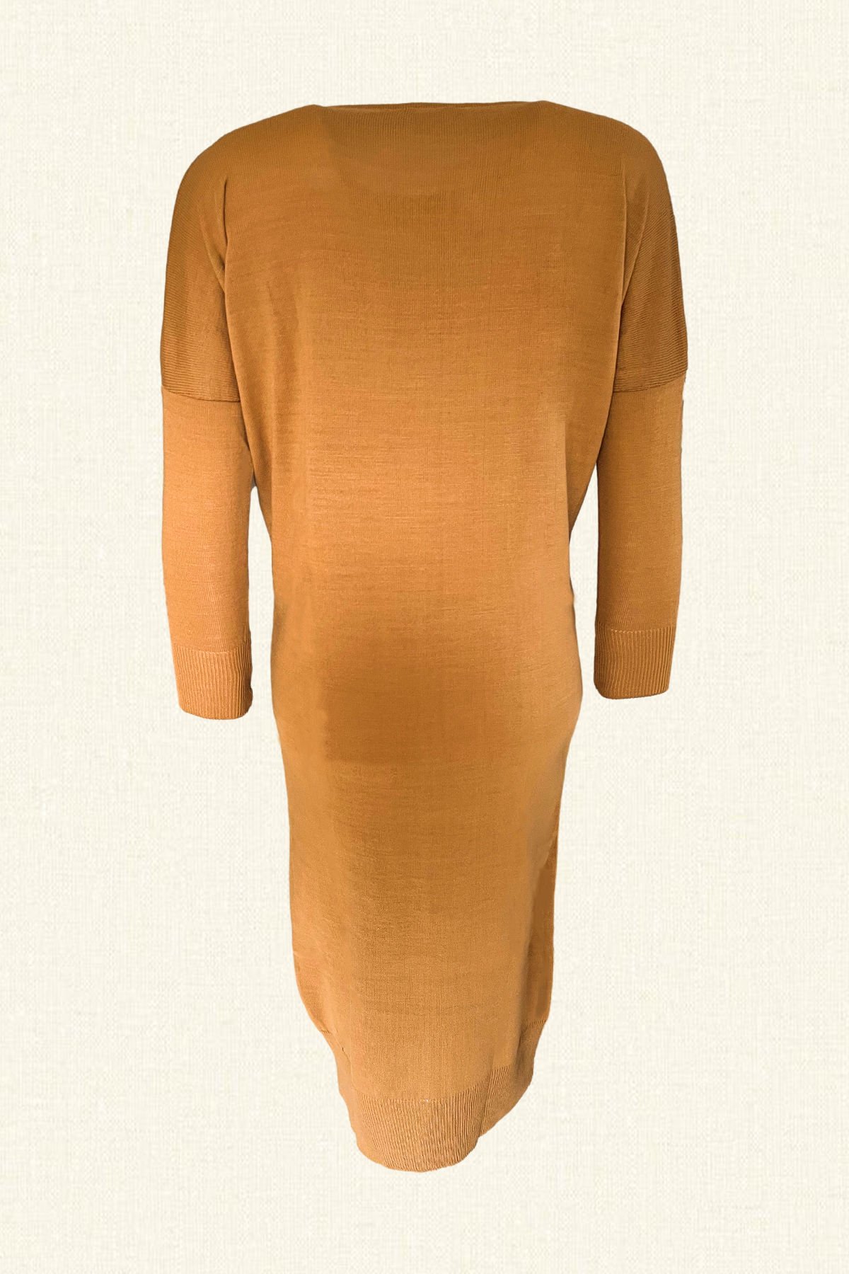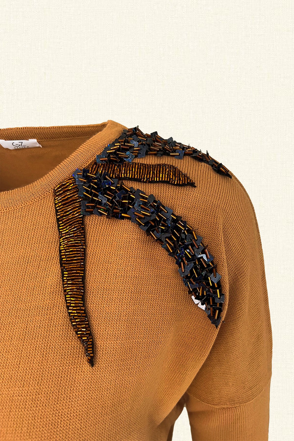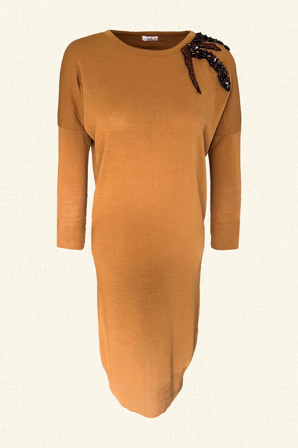 Elbisenin yaka kısmında bakır pul ve boncuklardan işlemesi bulunan, uzun kollu taba rengi triko elbise.