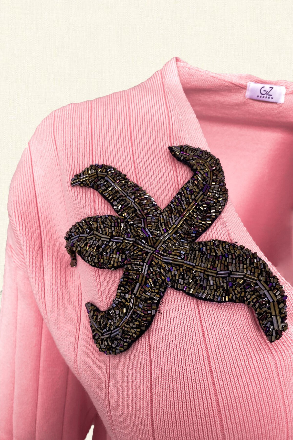 Yaka kısmında bakır kristal ve boncuklardan yıldız işlemesi bulunan, iç kısmında kruvaze detaylı pembe hırka.