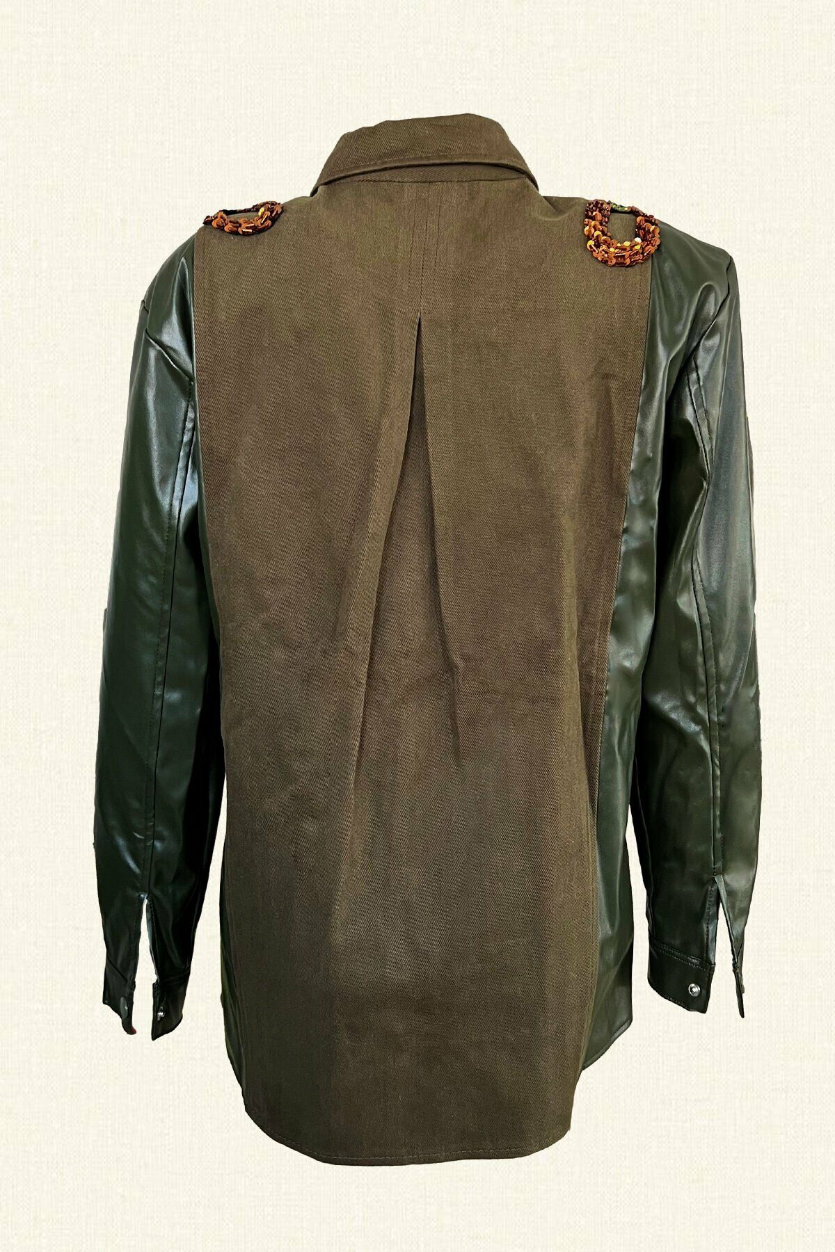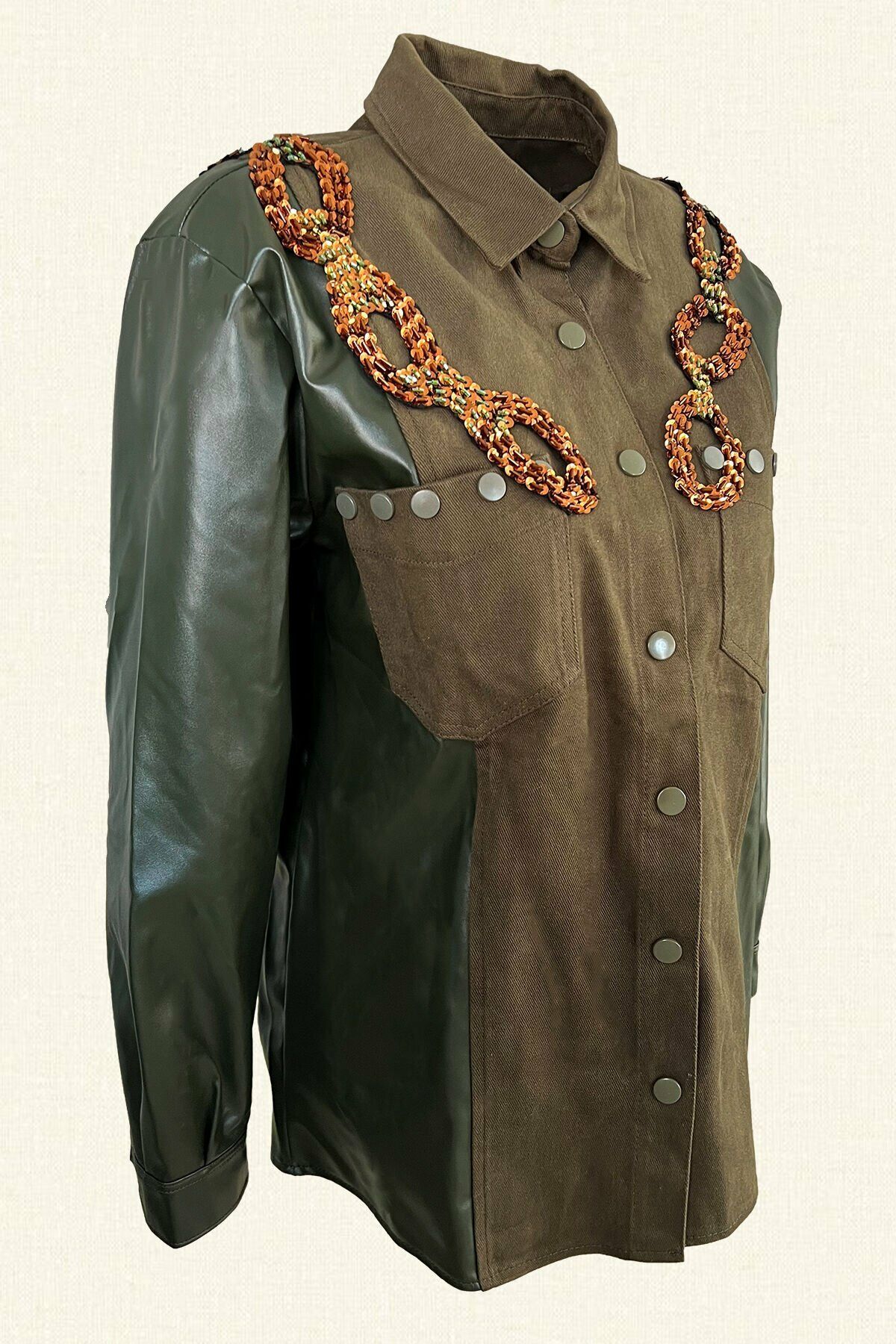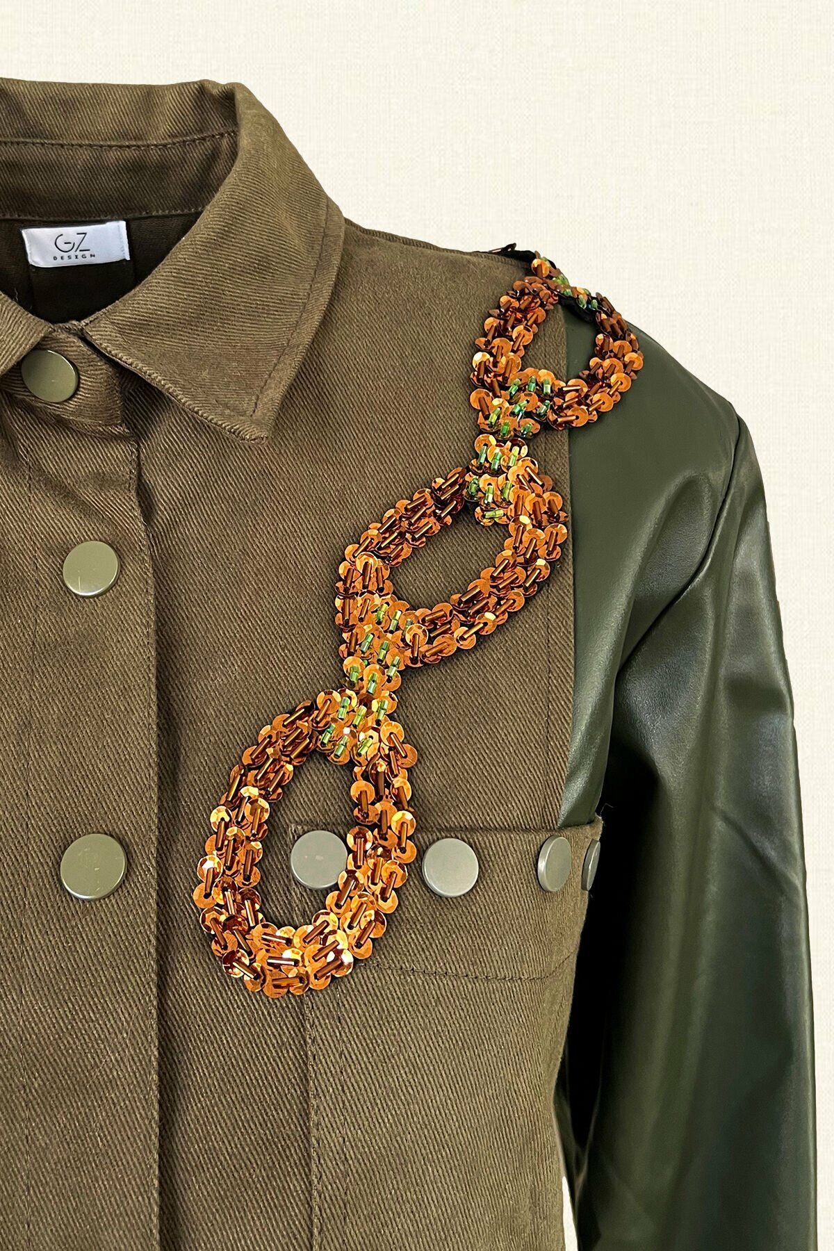 Kolları deri detaylı, ön kısmından omuzuna kadar bakır renk pullu zincir motifi işlemeli asker yeşili jean ceket.
