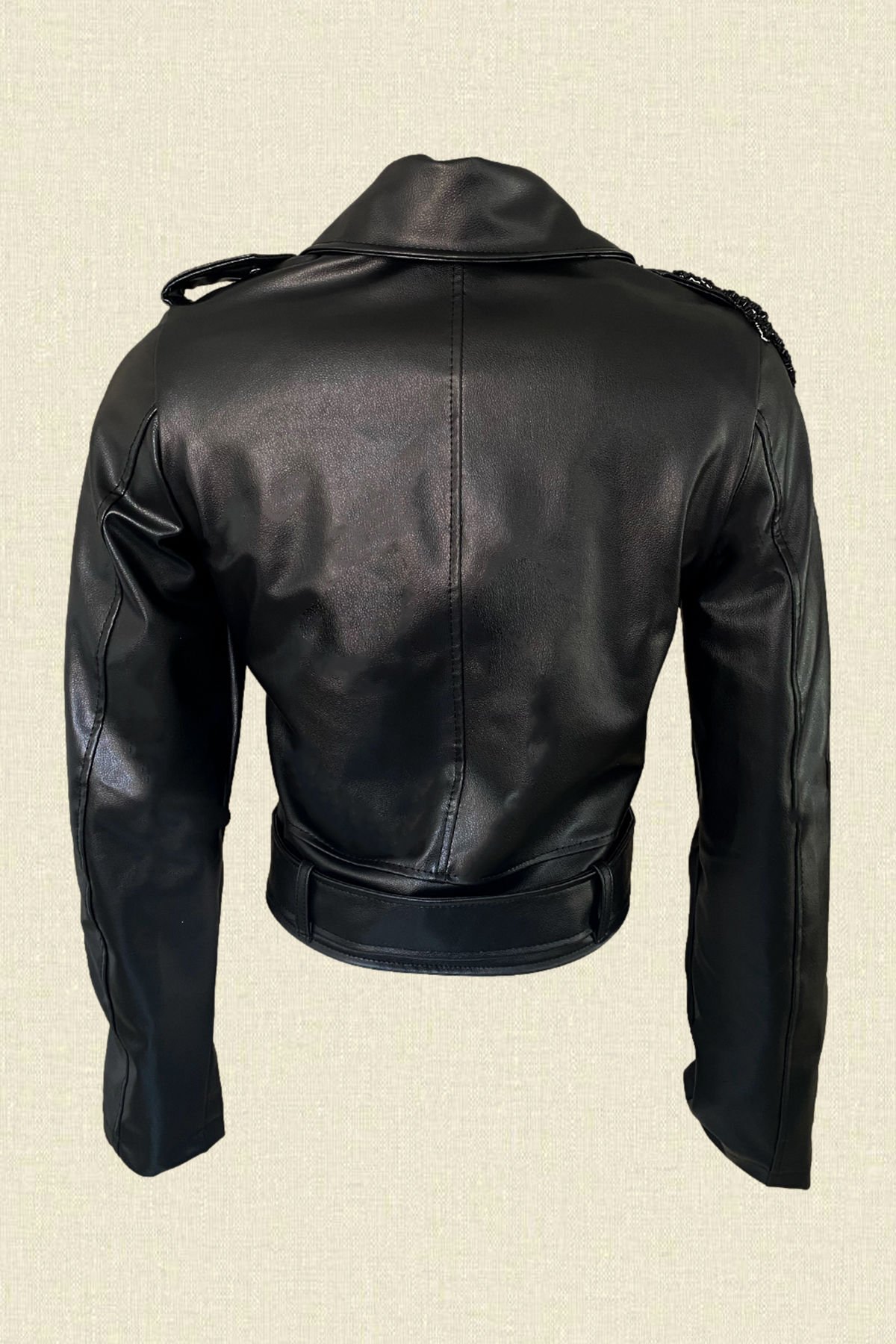 Omuzlarında deri üzeri boncuk işlemeli ,kemer detaylı siyah deri ceket.
