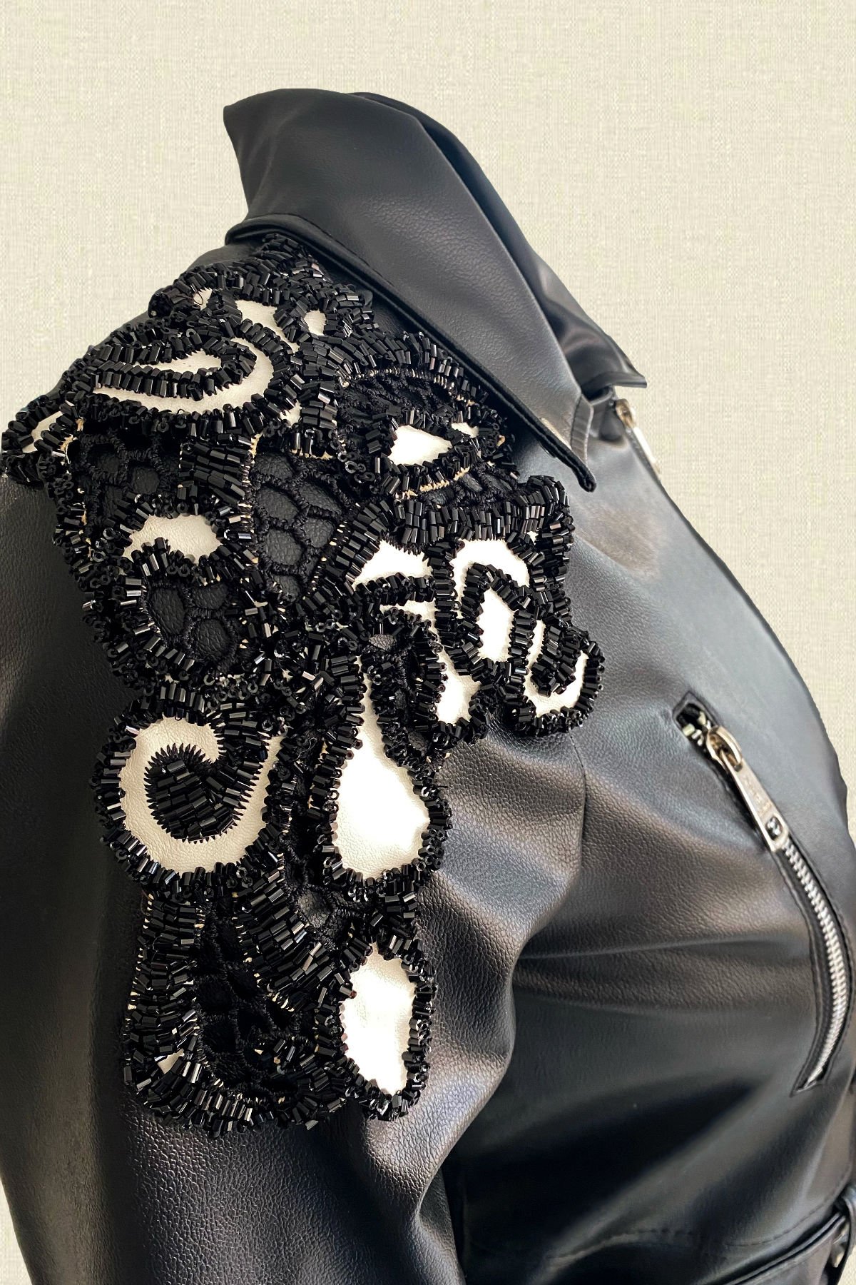 Beyaz Deri Üzeri Boncuk İşlemeli Siyah Biker Deri Ceket
