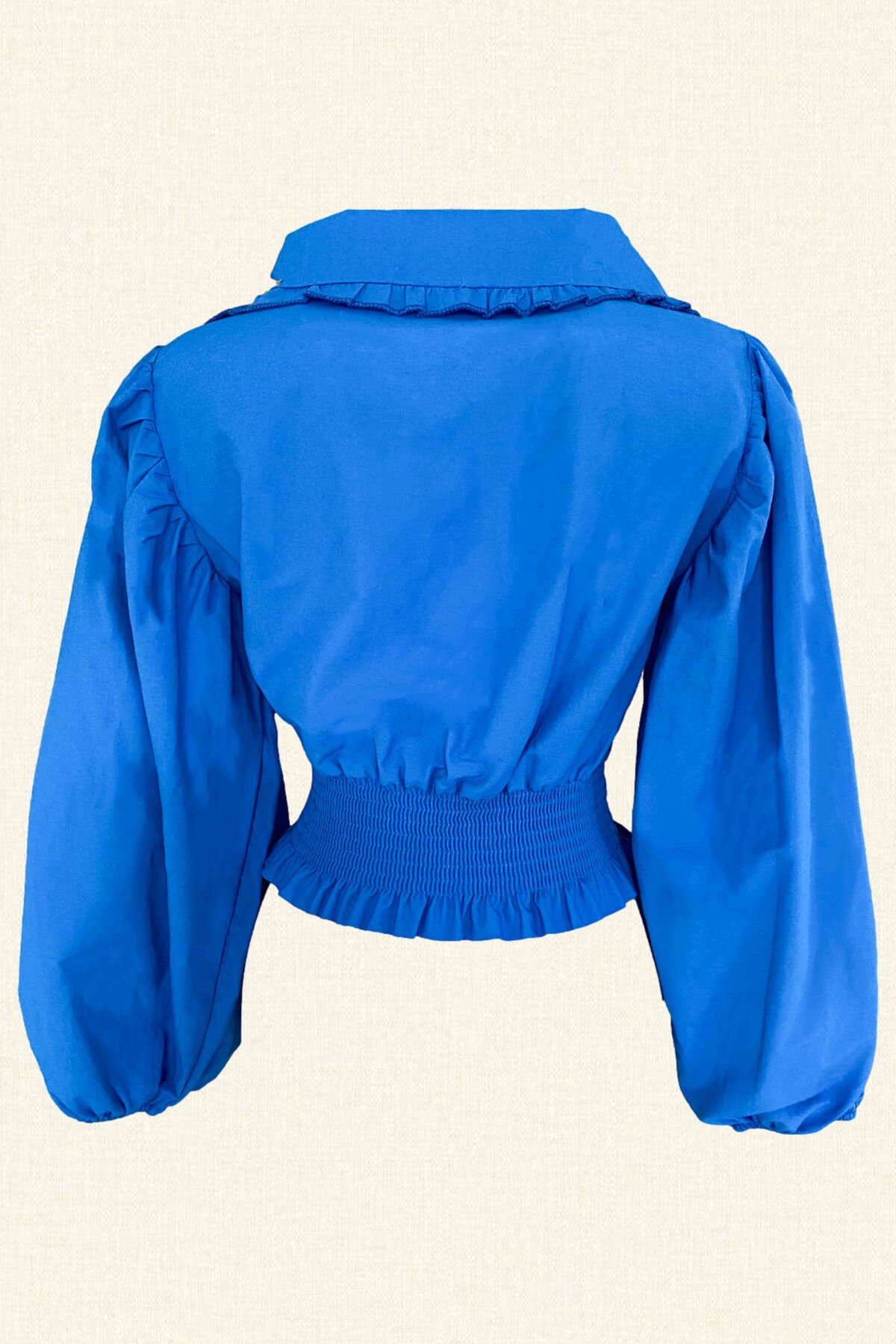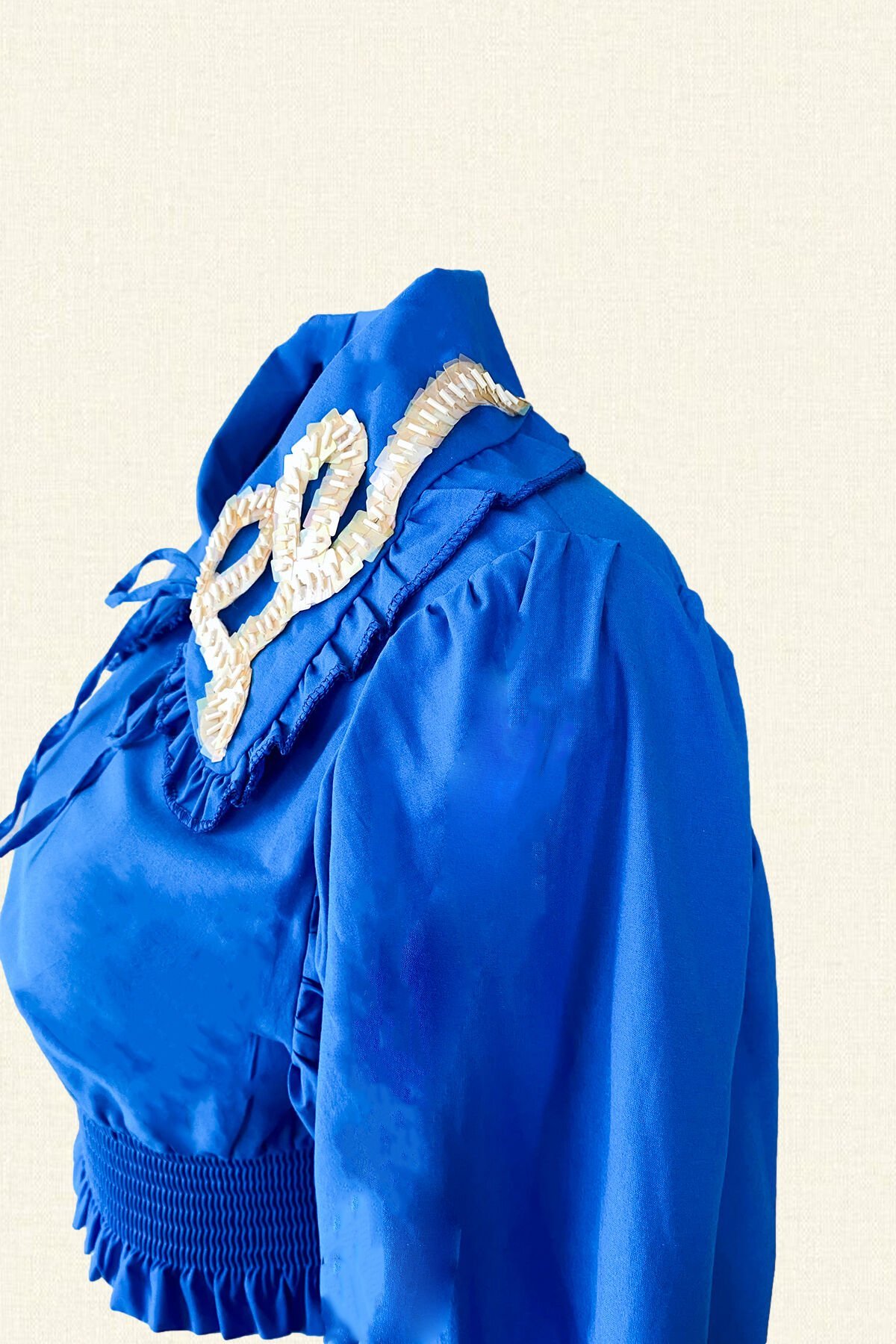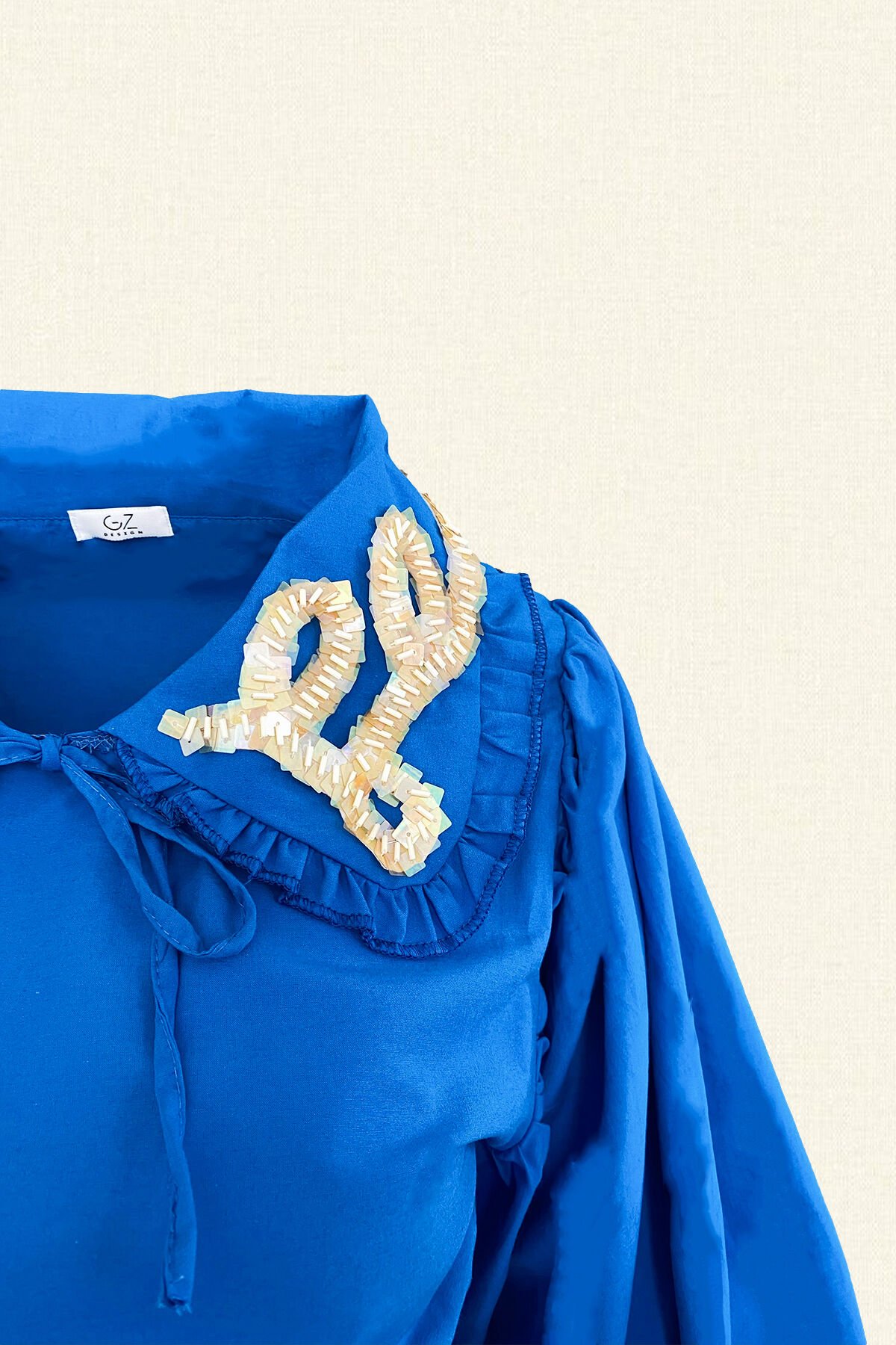 Beyaz İşlemeli Balon Kollu Mavi Gömlek