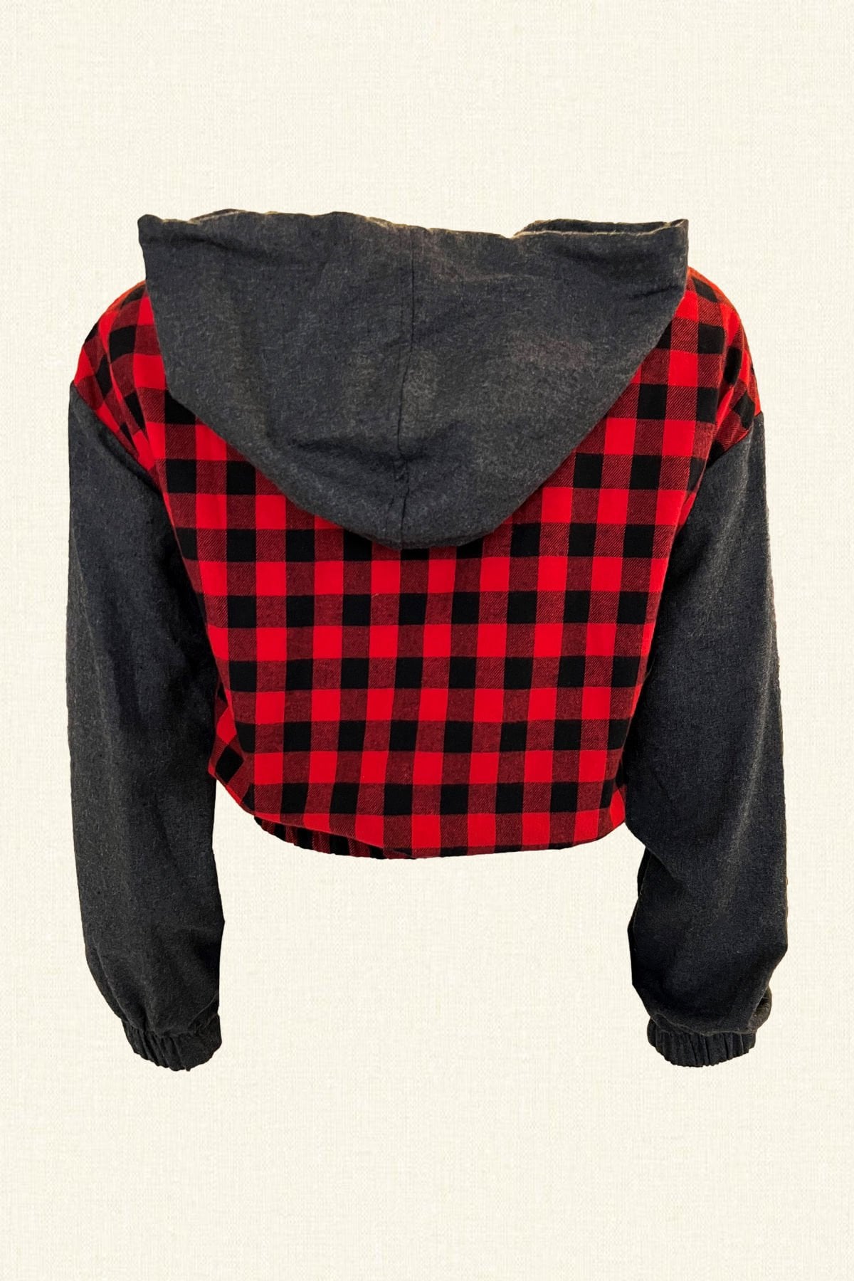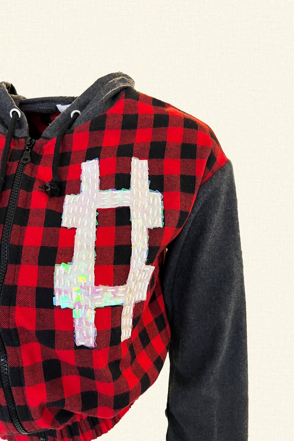 Beyaz İşlemeli Kırmızı Ekose Desenli Fermuarlı Sweatshirt