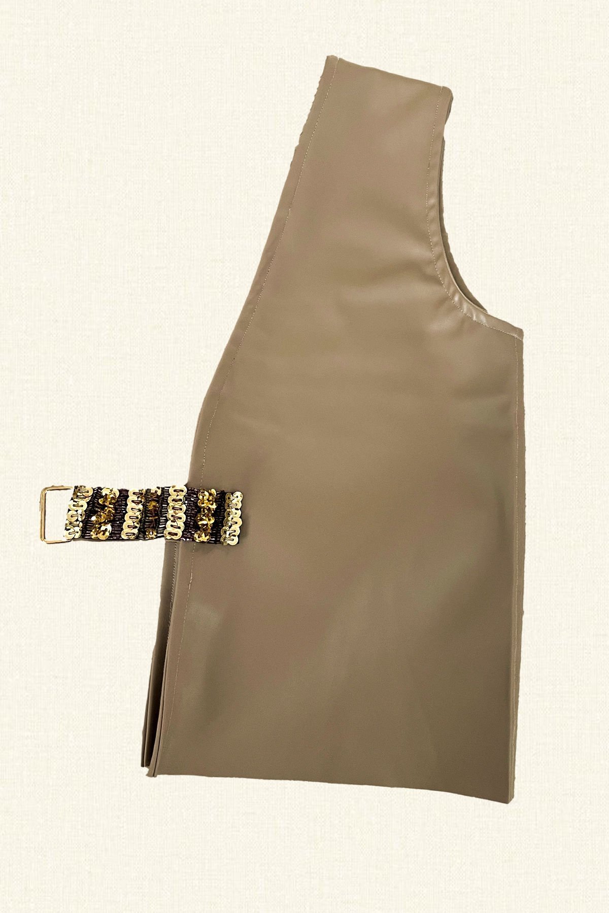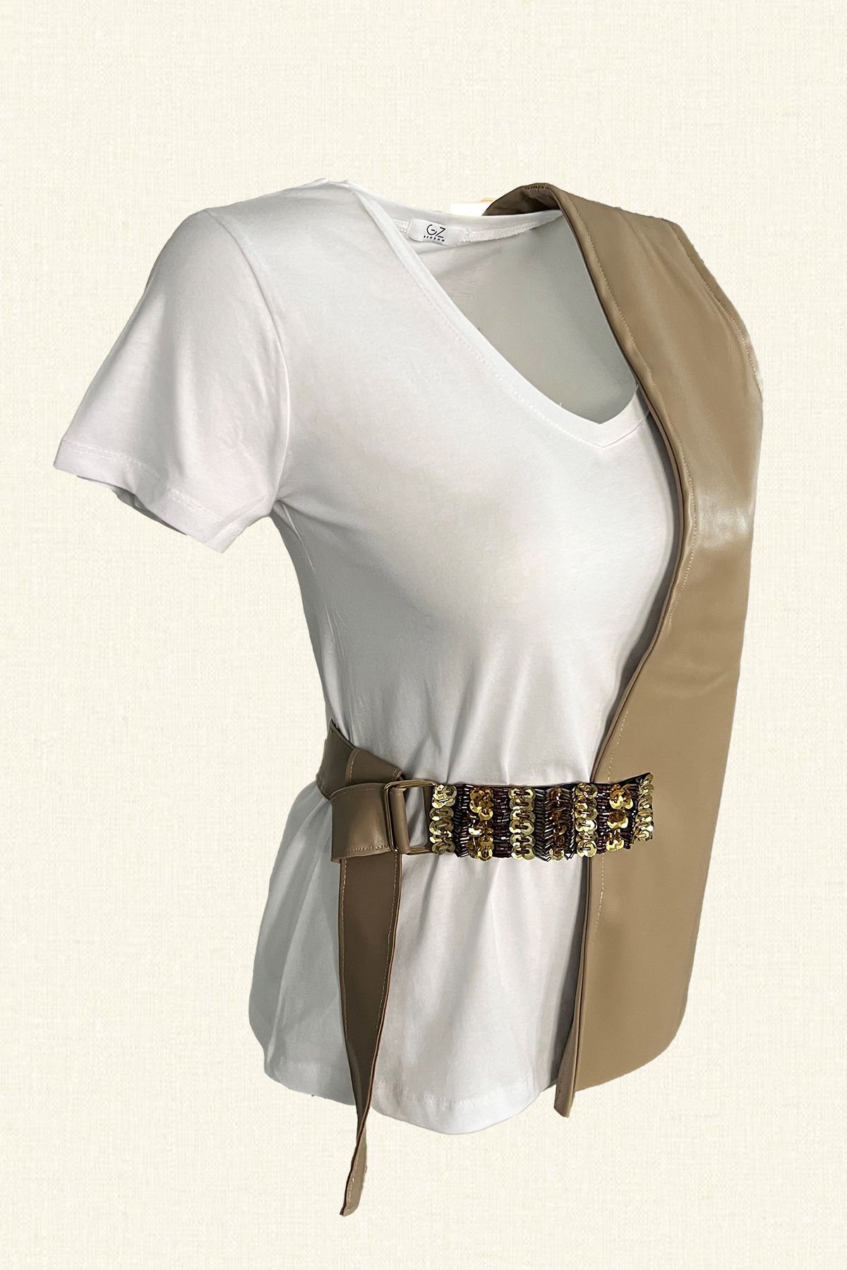 Boncuk İşlemeli Kemer Detaylı Vizon Renk Deri Yarım Yelek- Tişört Dahildir