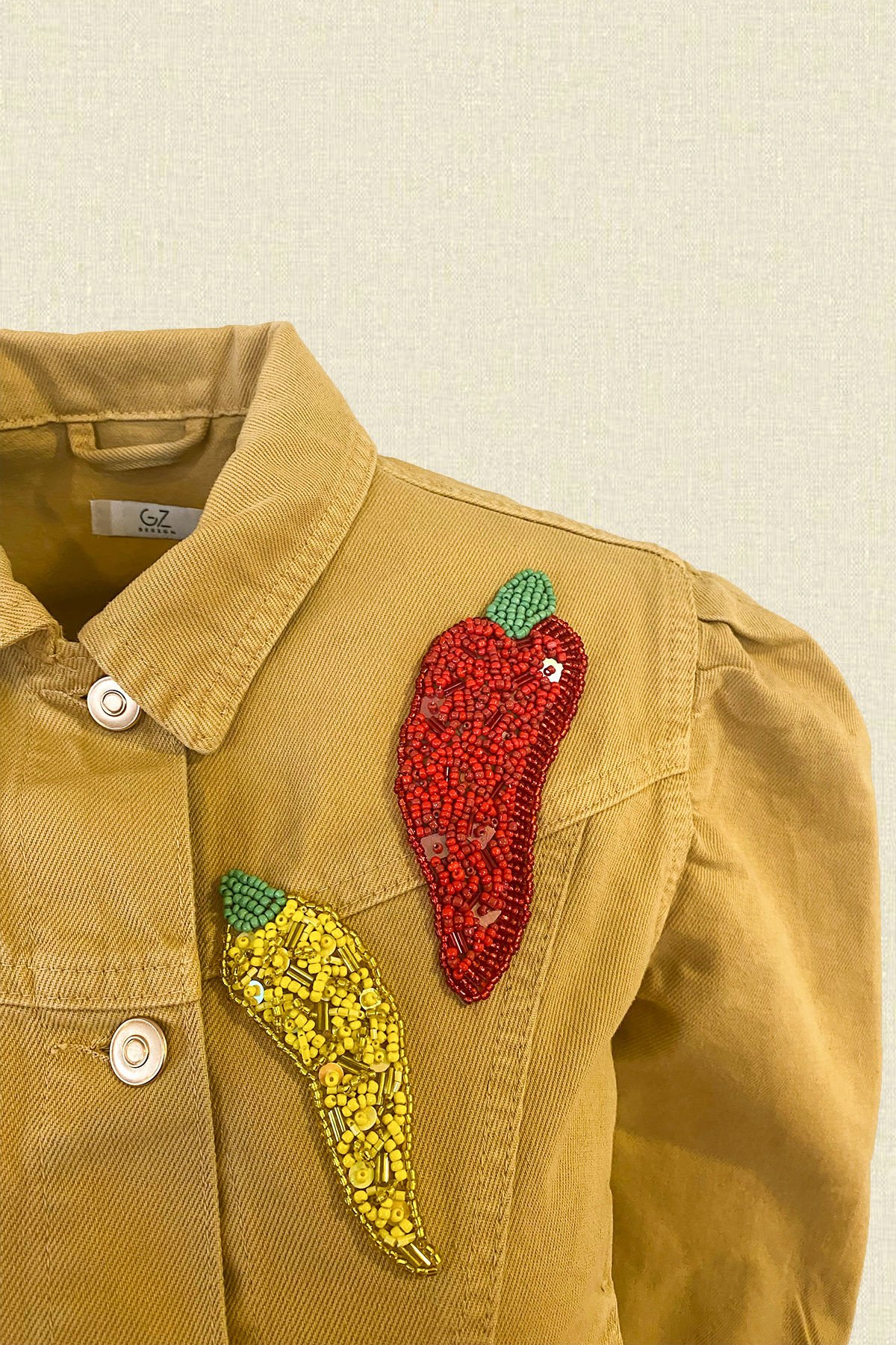 Kırmızı, yeşil ve sarı boncuklardan işlenmiş biber motifleri, balon kollu hardal renk jean ceket.
