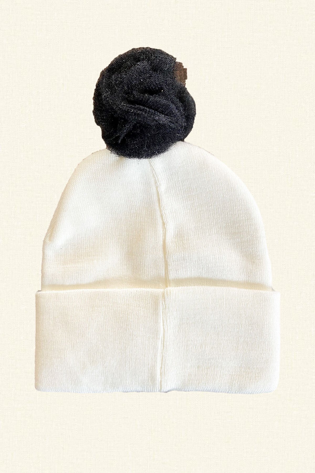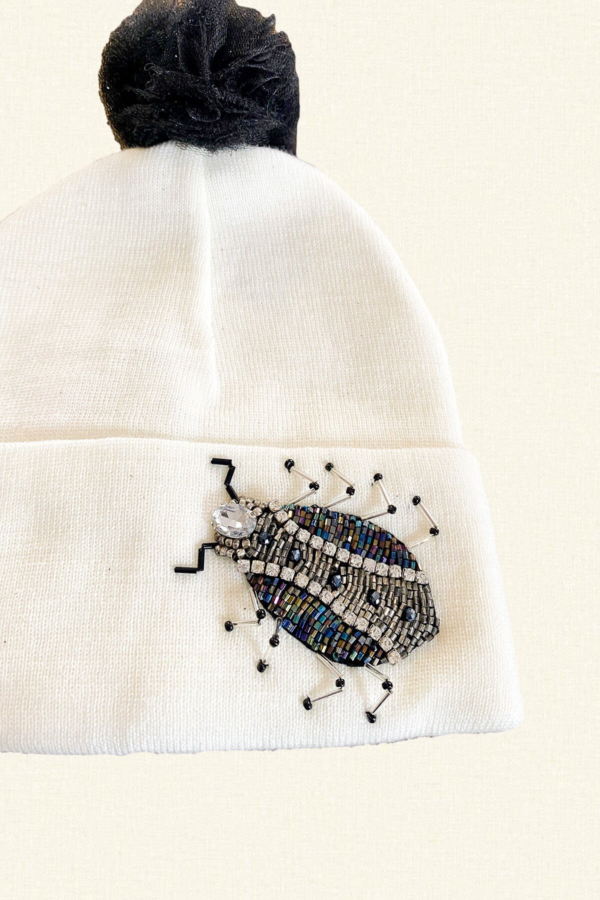 Üzerinde boncuk ve kristallerden böcek işlemeli, siyah tül ponponlu beyaz bere.