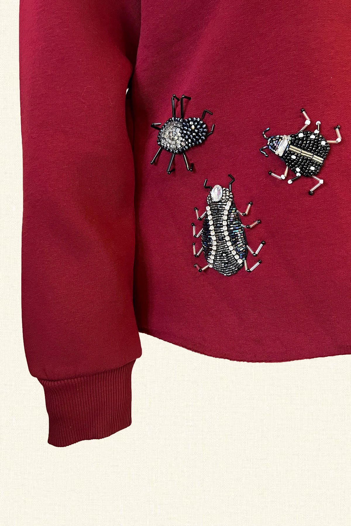 Kristal taş ve boncuklarla böcek motifi işlemeli bordo renk sweatshirt.