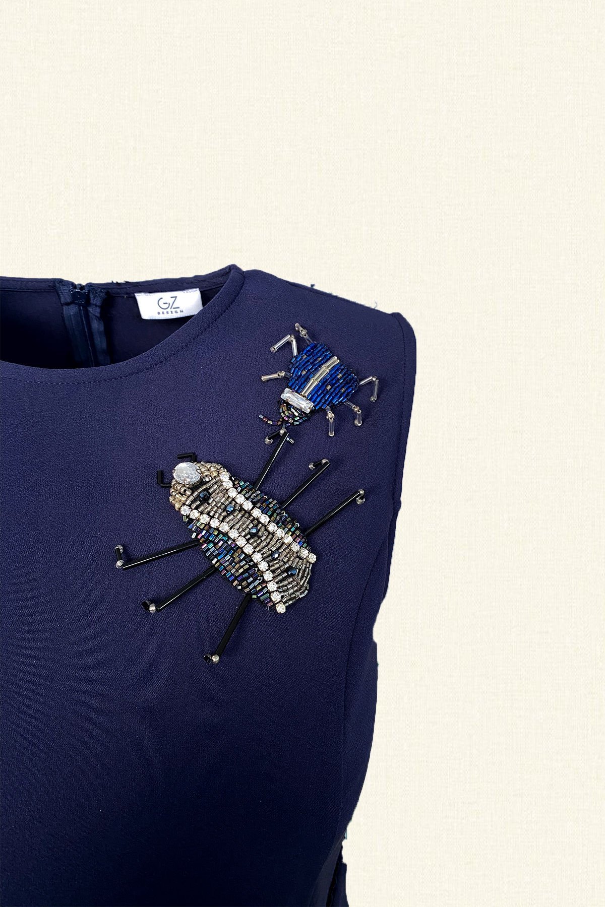Boncuk işlemeli böcek motifleriyle detaylandırılmış lacivert elbise.