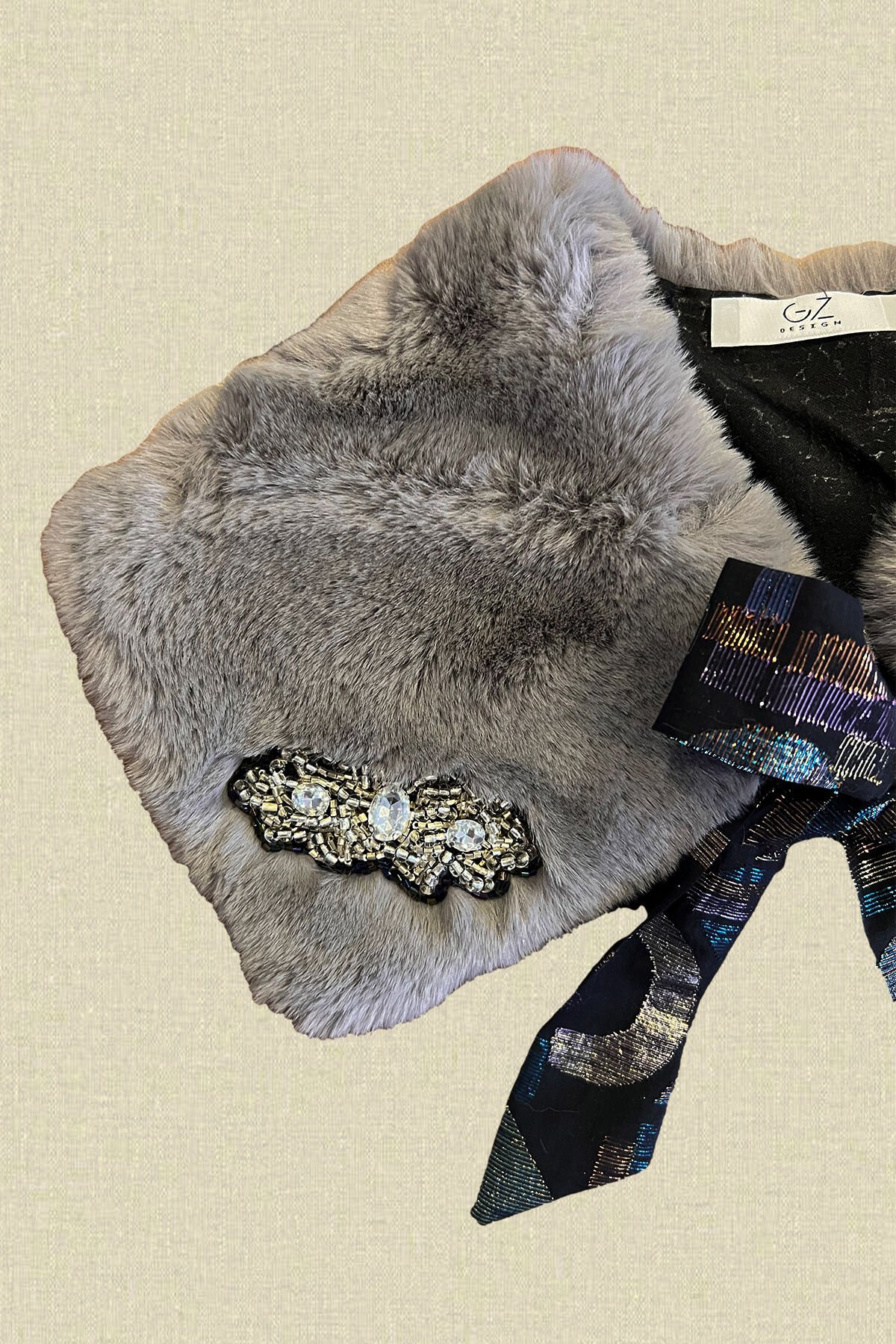 Boncuk işlemeli, simli kurdele detaylı, gri kürk yaka.
