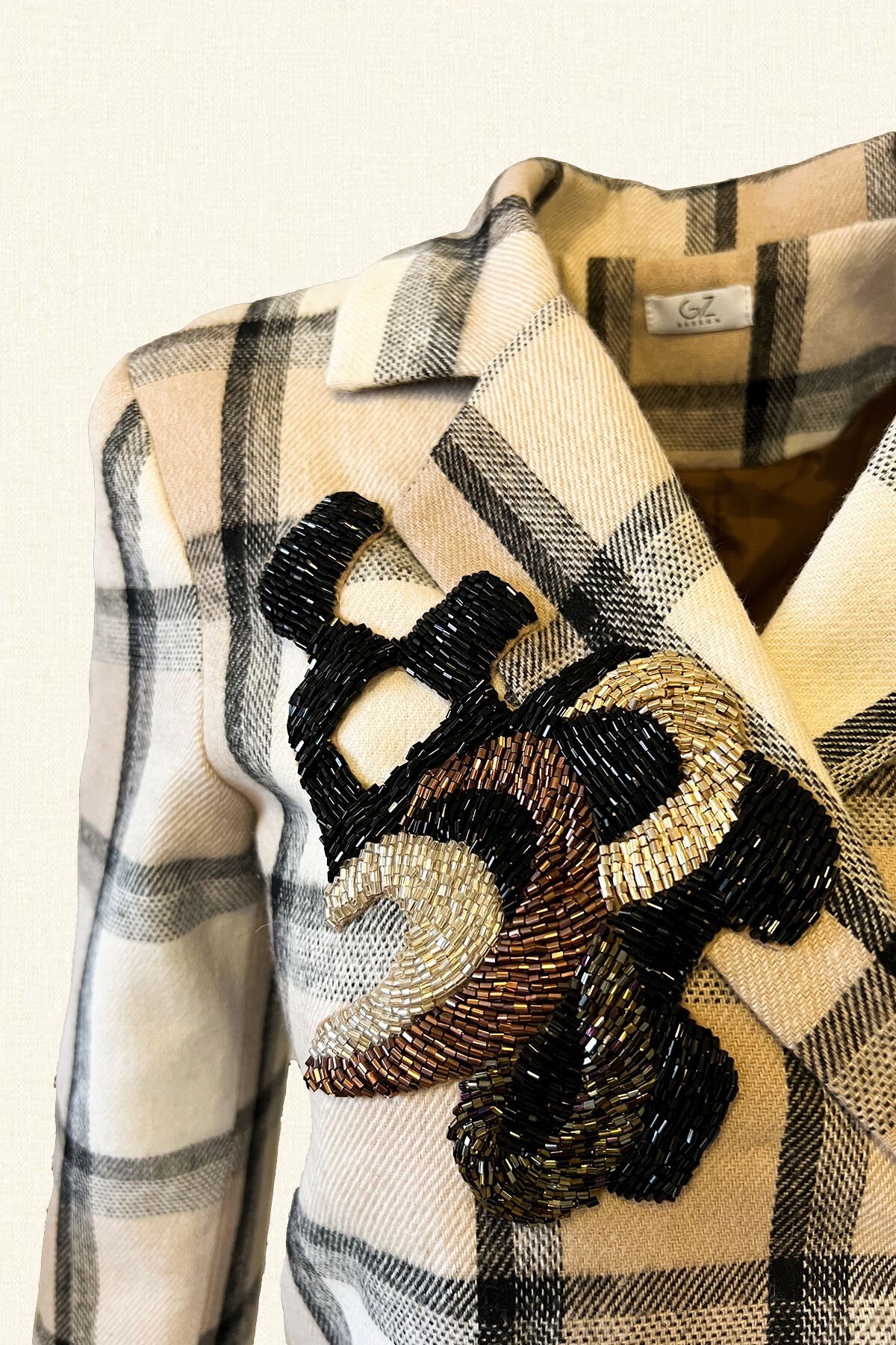 Kristal boncuk işlemeli camel renk ekose ceket.
