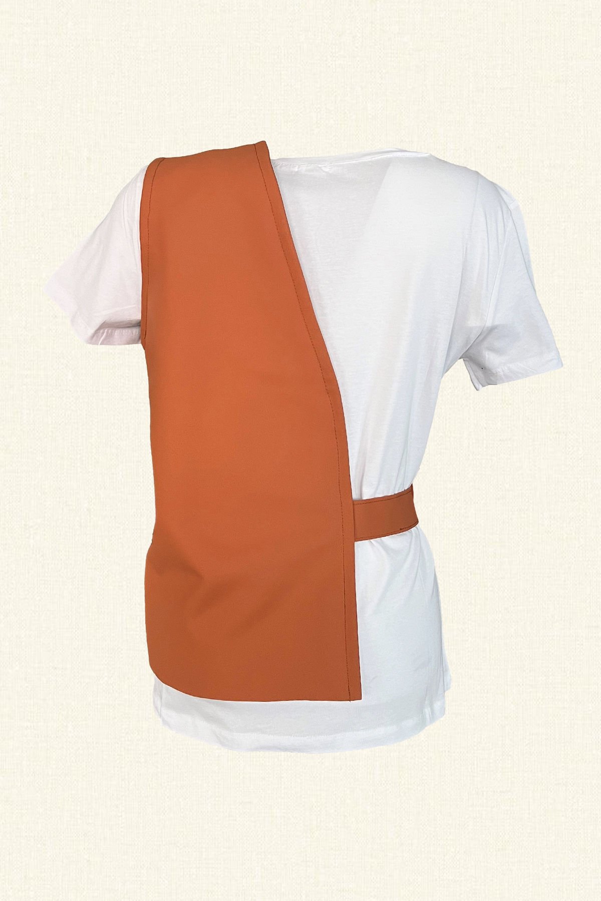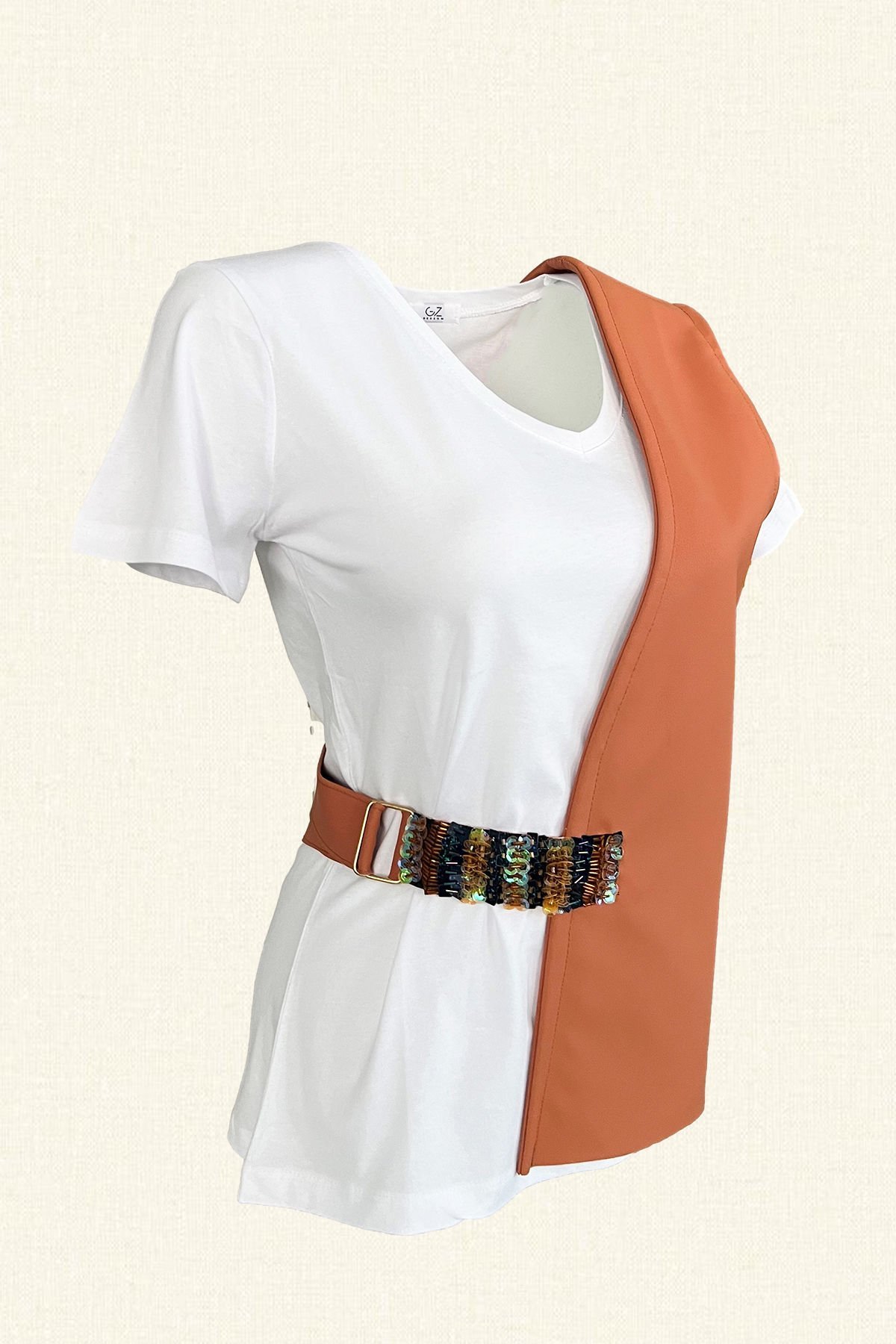 Beyaz tişört üzerine somon renk deri yelek, gold boncuk işlemeli ayarlanabilir kemeri bulunmaktadır.Deri yelek çıkarılıp, ayrı kullanılabilir.