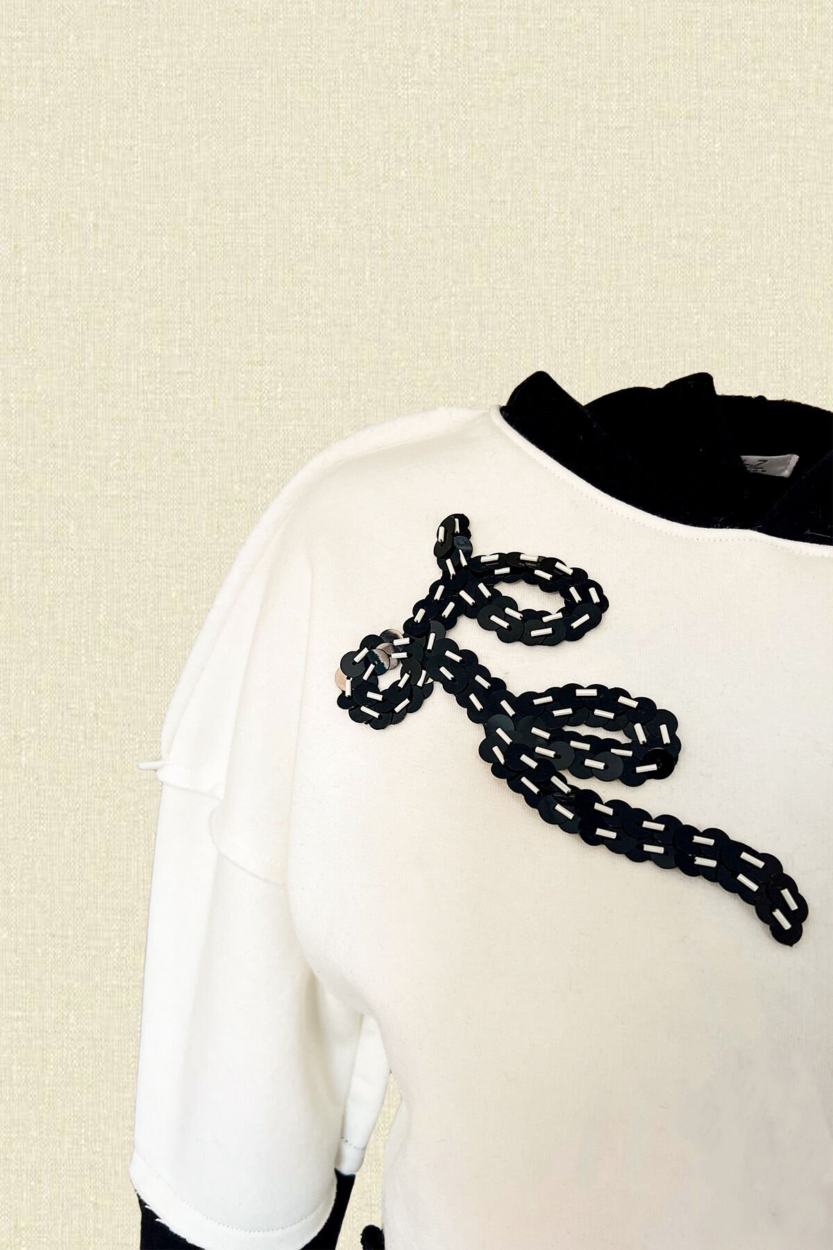 Ön kısmında siyah pul ve beyaz boncuklardan işlemesi bulunan, kapüşonlu, bilekleri lastik detaylı siyah-beyaz sweatshirt.