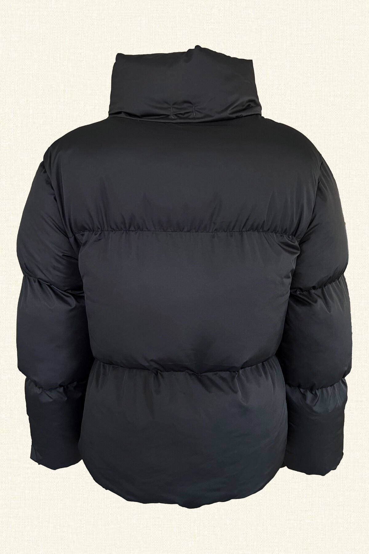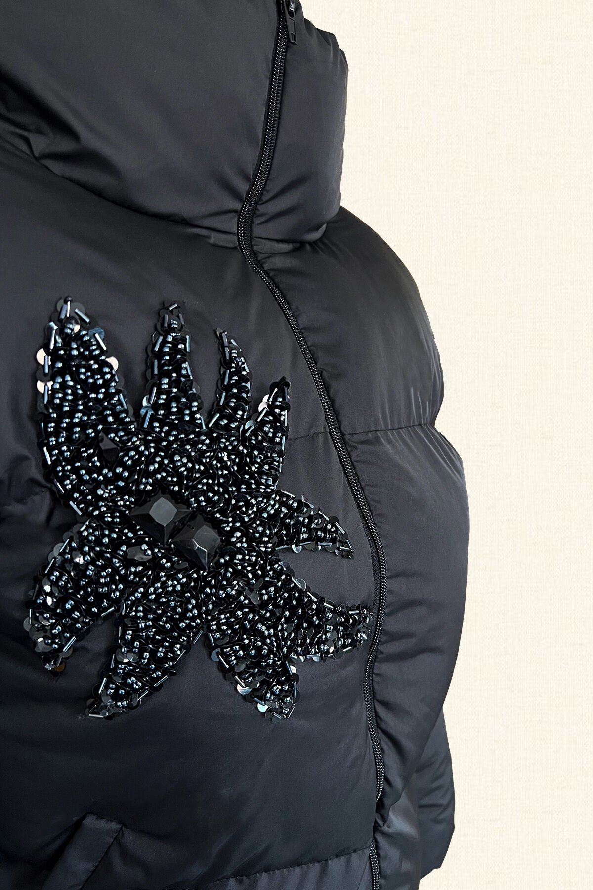 Ön kısmından siyah boncuklardan işlemesi bulunan, dik yakalı, siyah şişme mont.