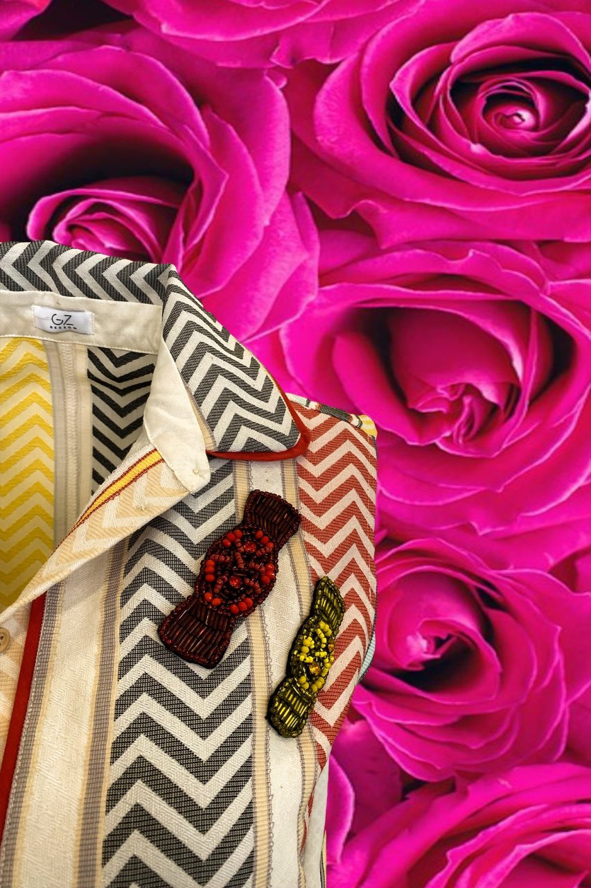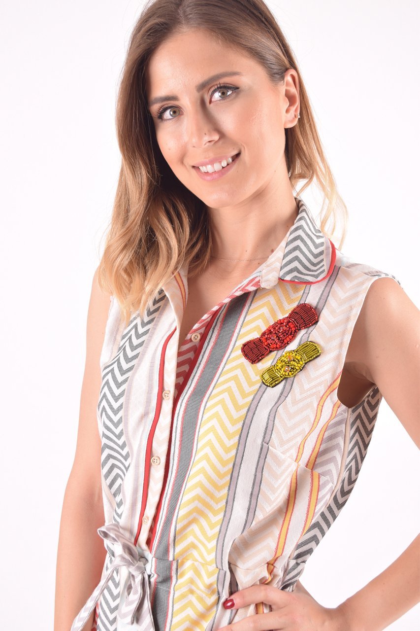 Sarı ve kırmızı renkli bonibon işlemeli, beli büzgülü sarı elbise.