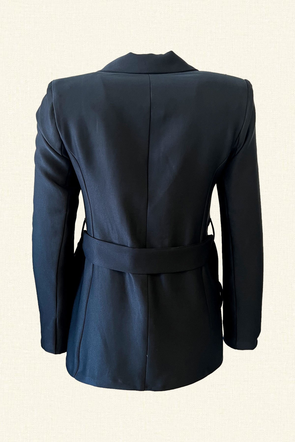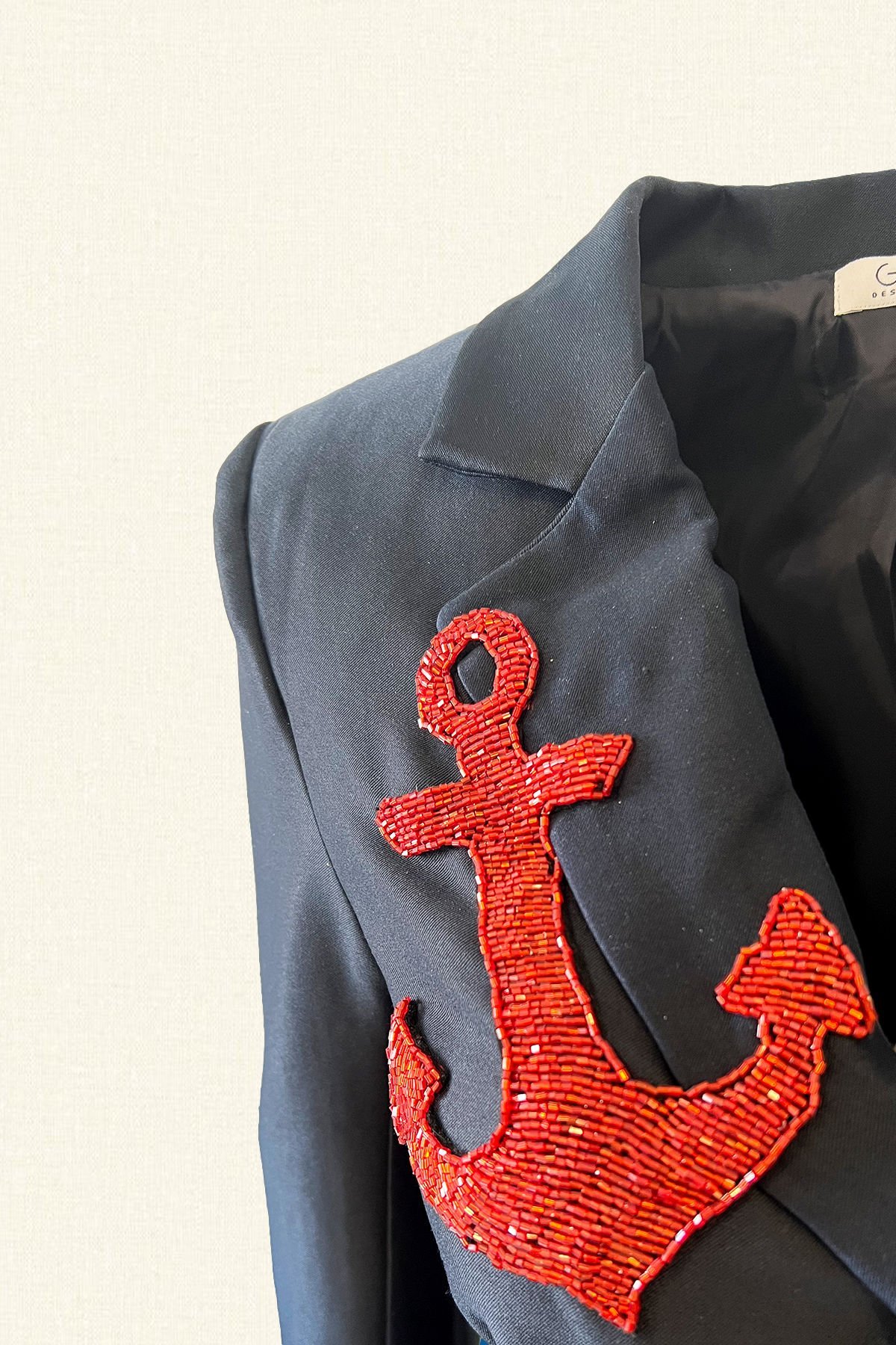 Önünde renkli kristal taş ve boncuk işlemeli kırmızı çapa motifli,gümüş düğme detaylı lacivert renk blazer ceket.