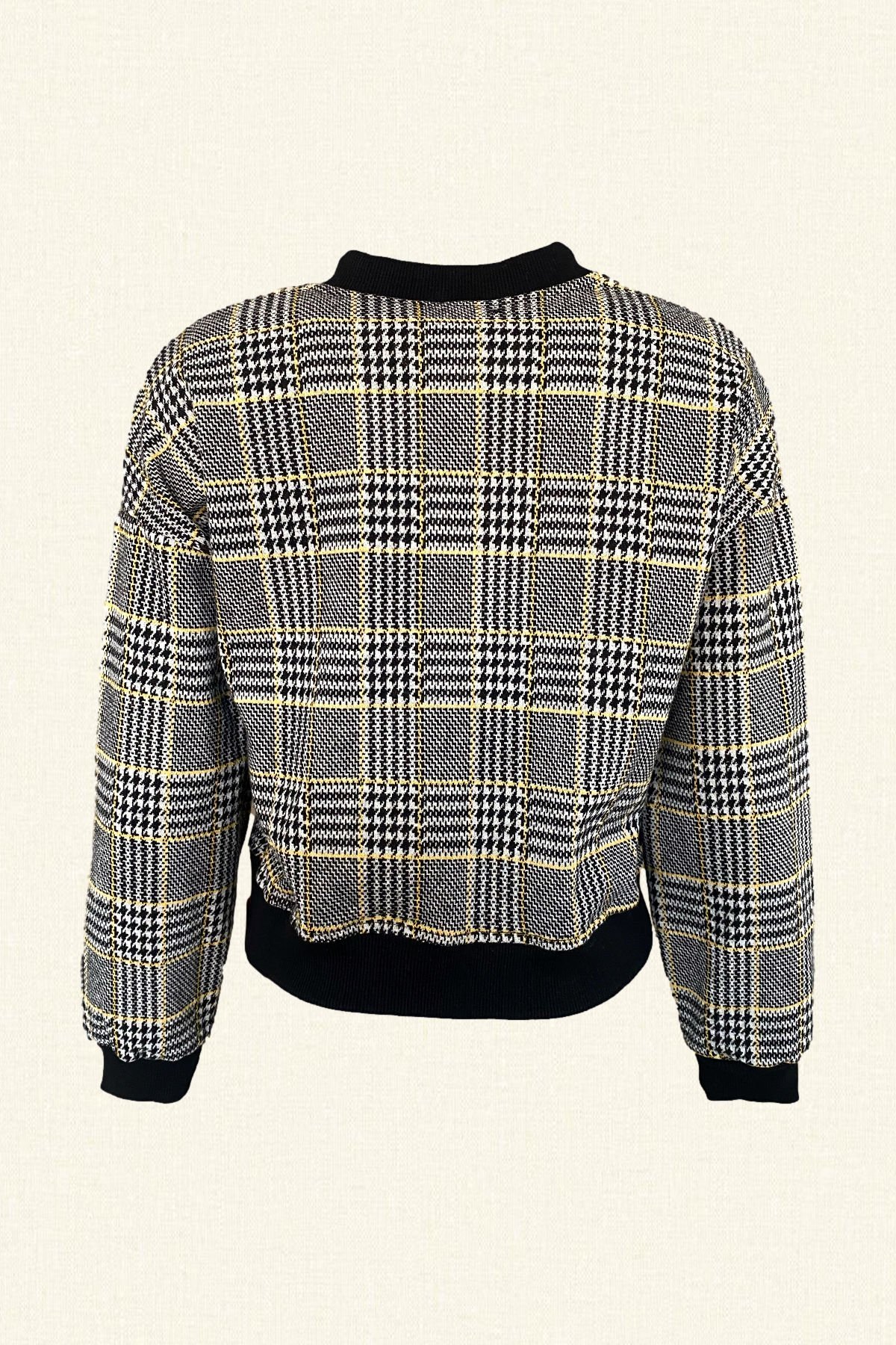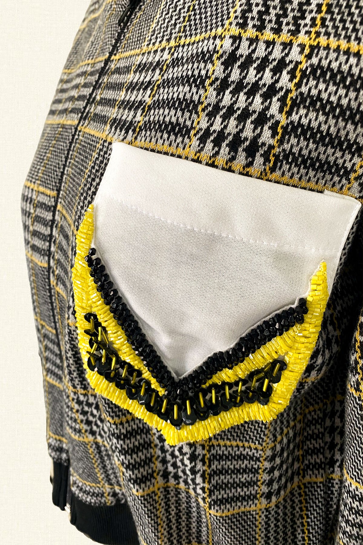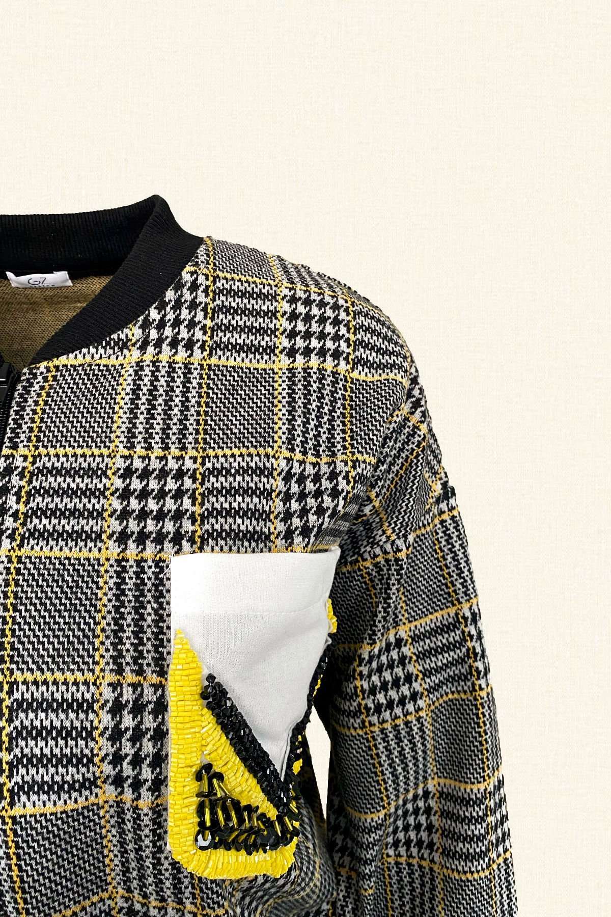 Cep kısmında sarı, siyah boncuk, kristal ve pullardan işleme, ekose desenli ceket.