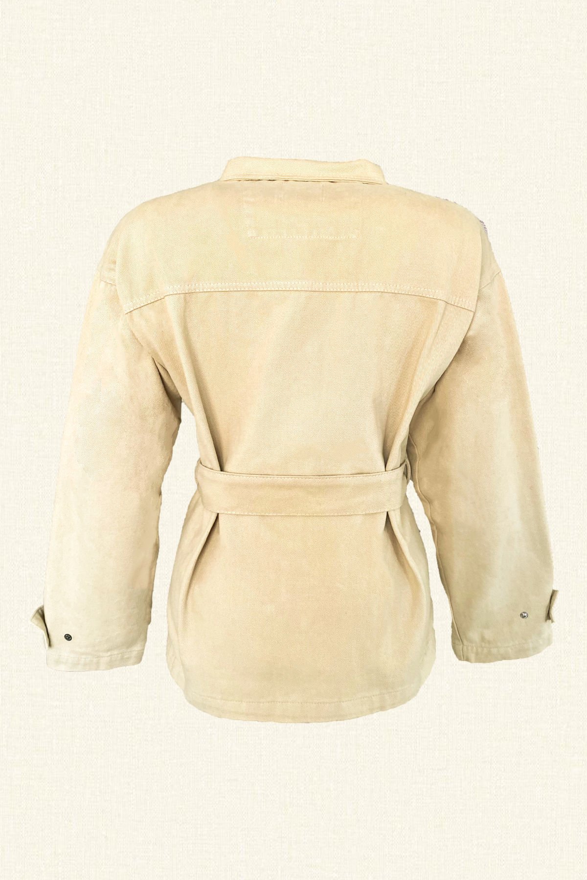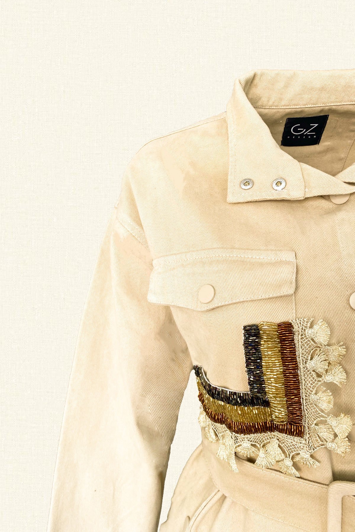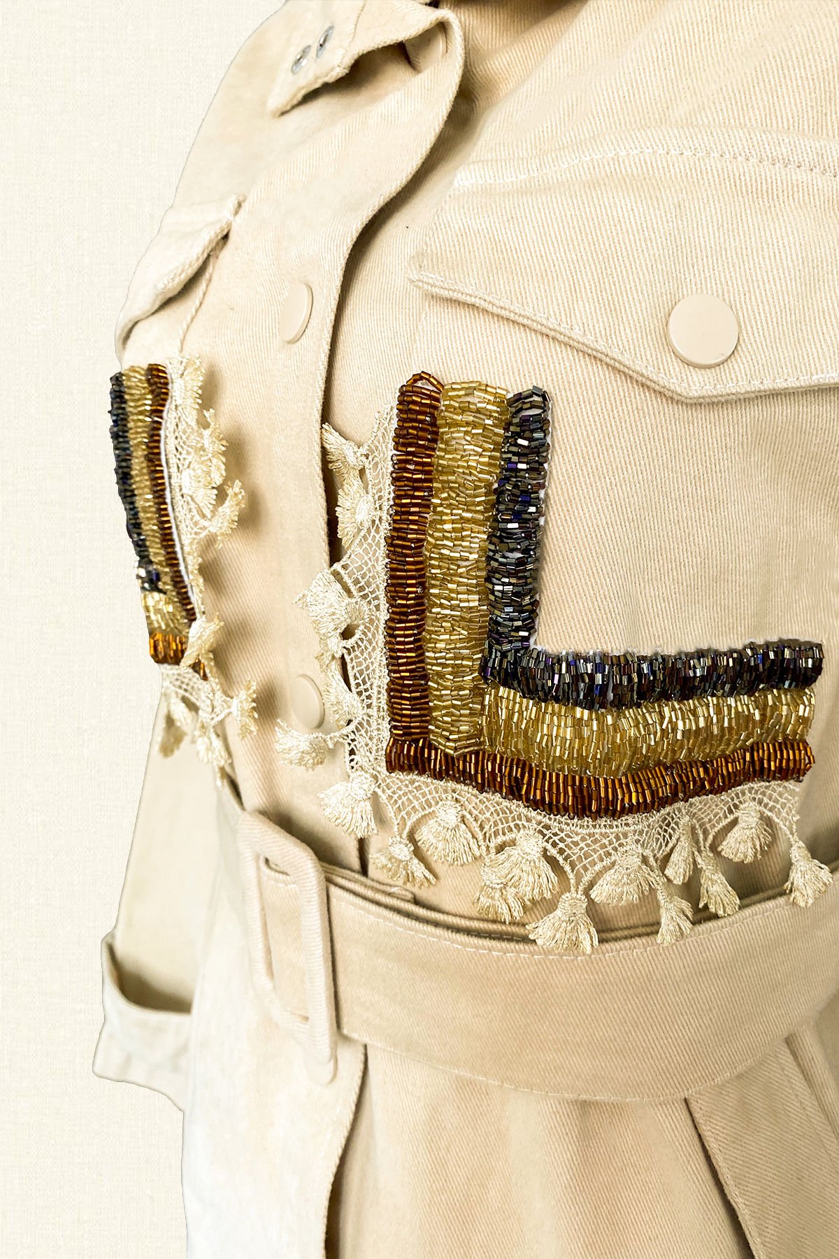 Ceplerinde 3 renk boncuk işlemeli, püskül detayı bulunan, kemer detaylı krem renk jean ceket.
