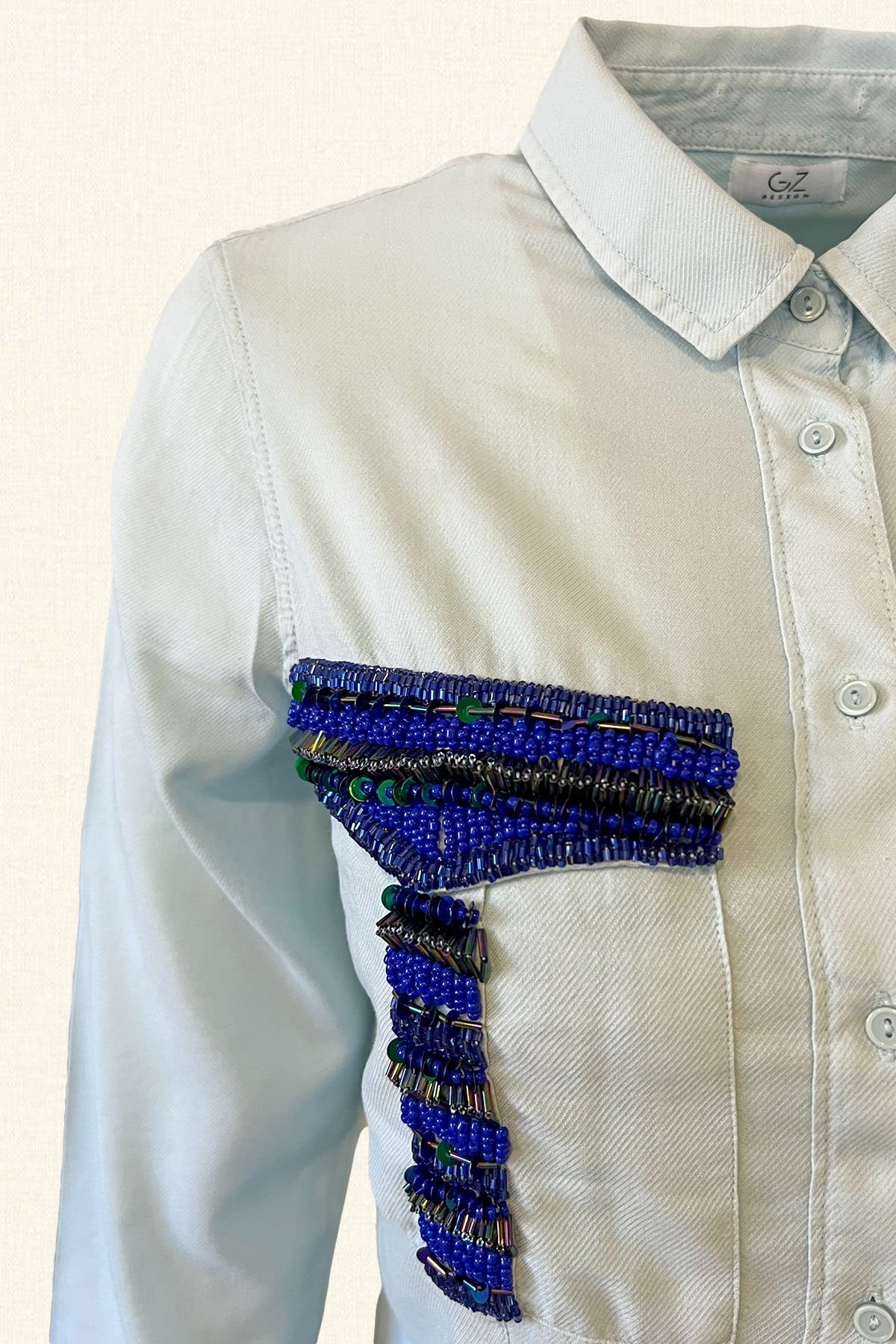 Cepleri Kristal Boncuk İşlemeli Mavi Gömlek