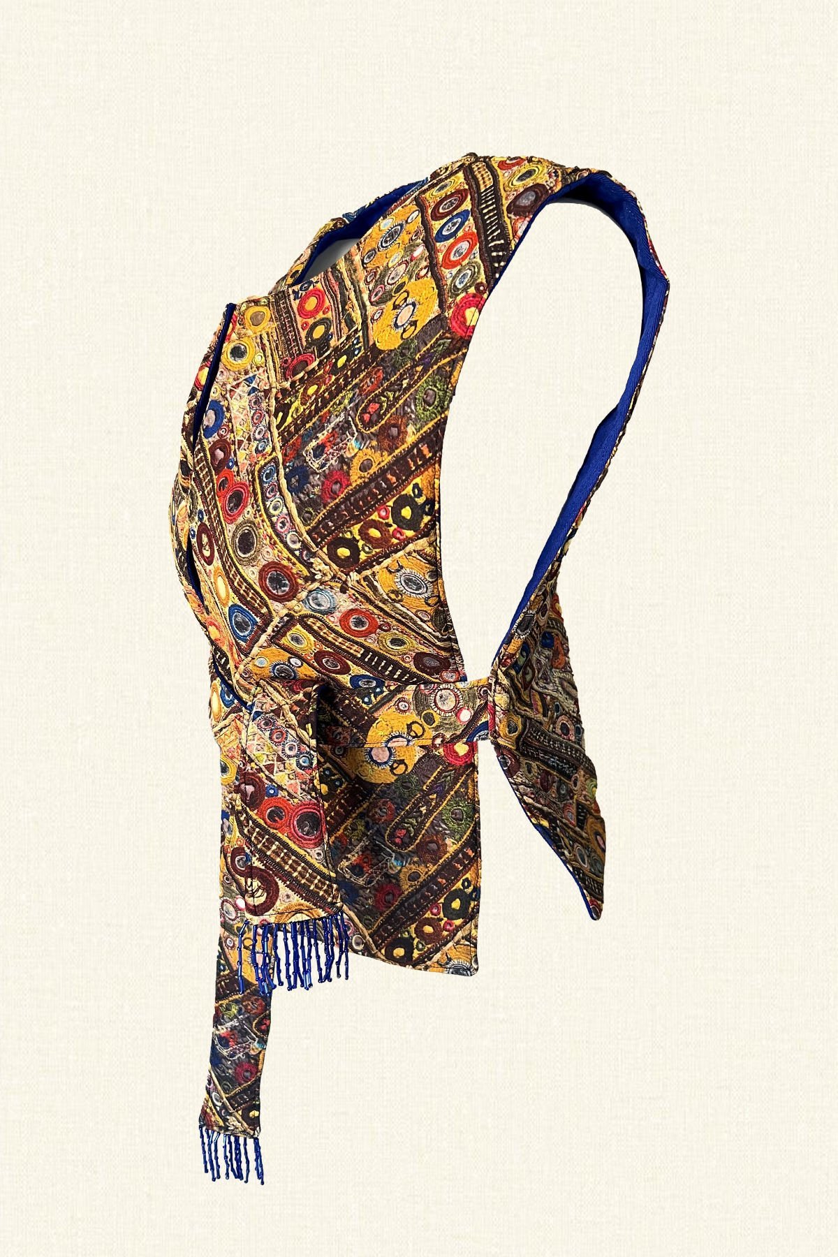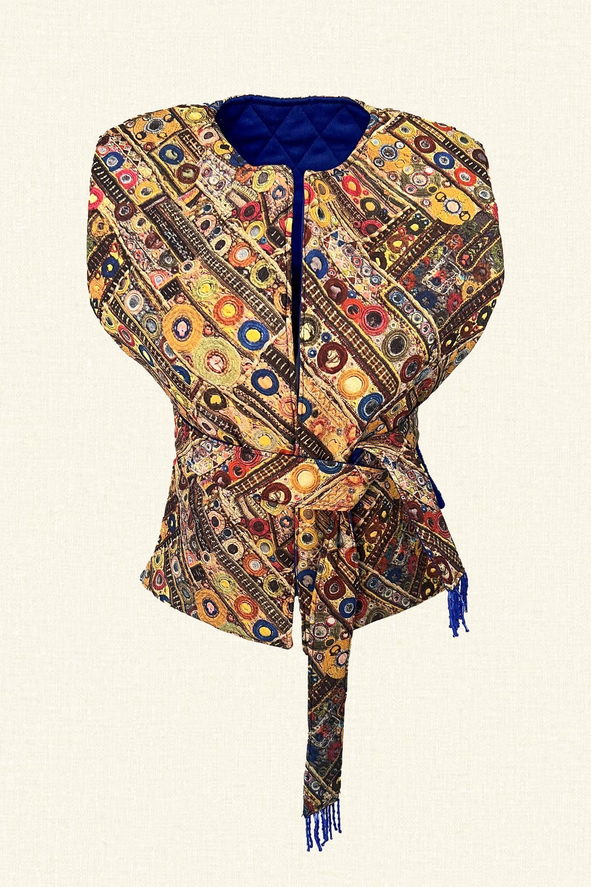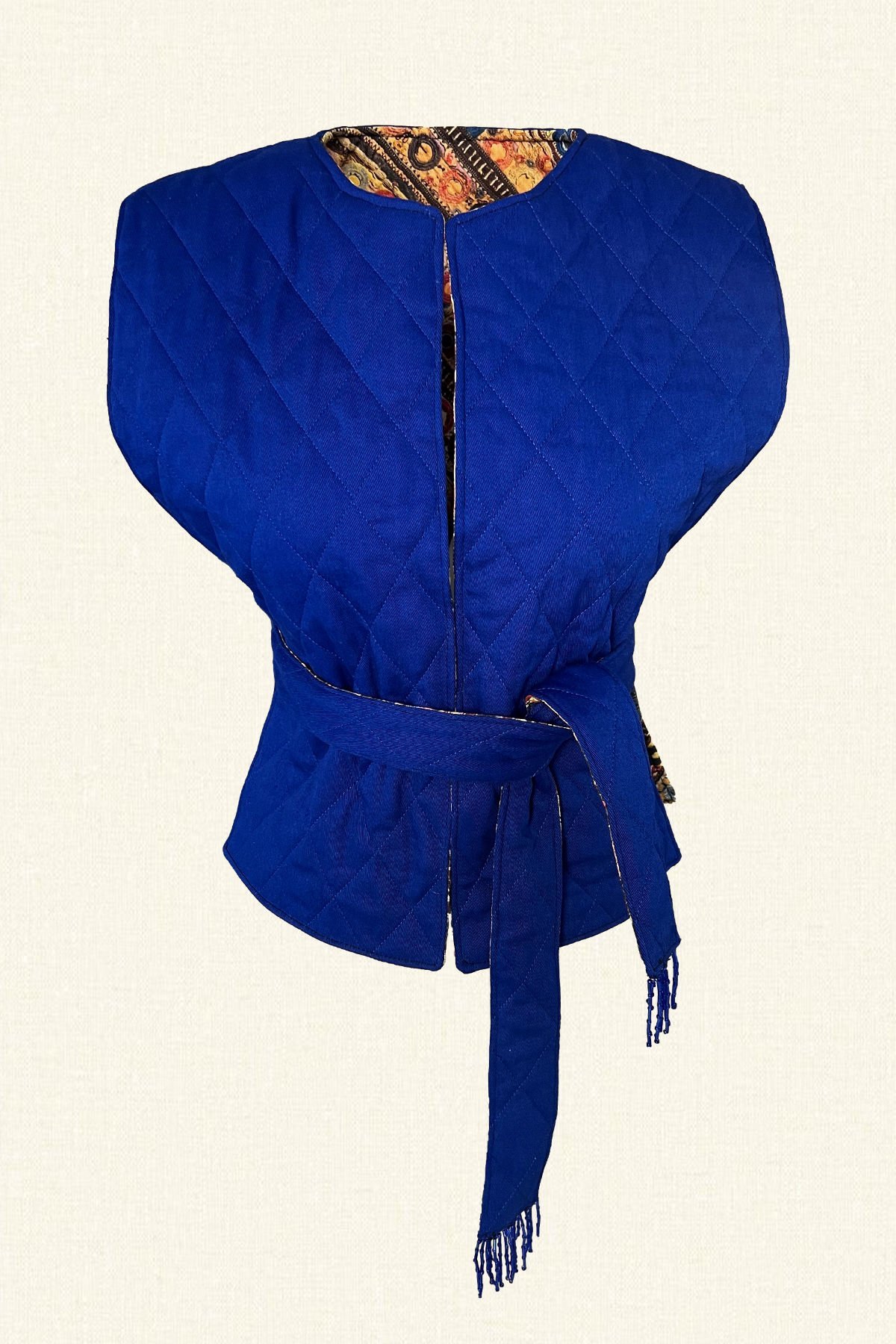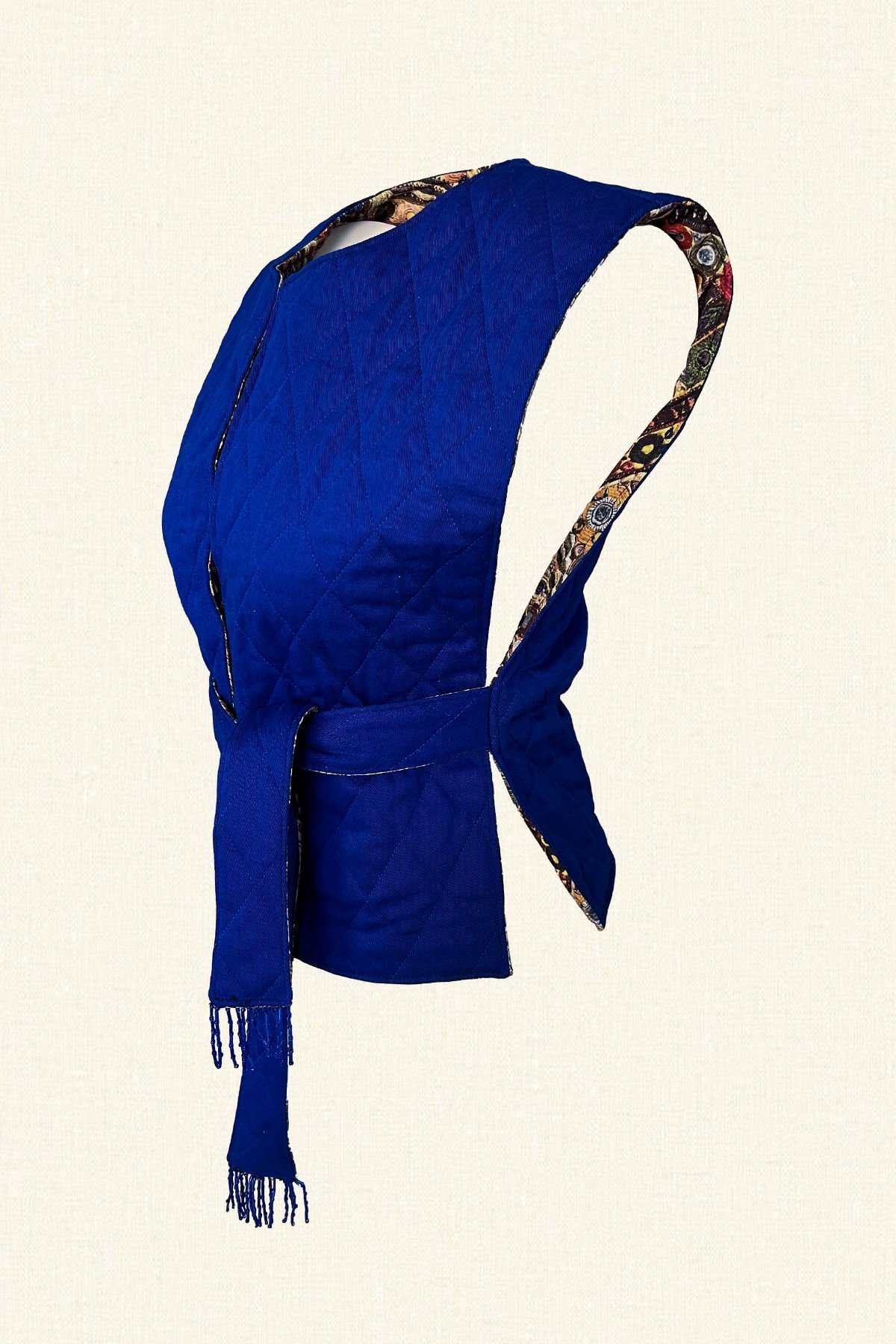 Çift taraflı giyilebilen bir tarafı mavi kapitone diğer tarafında şal deseni bulunan, belinde kemer ucu boncuk püskül işlemeli şişme yelek.