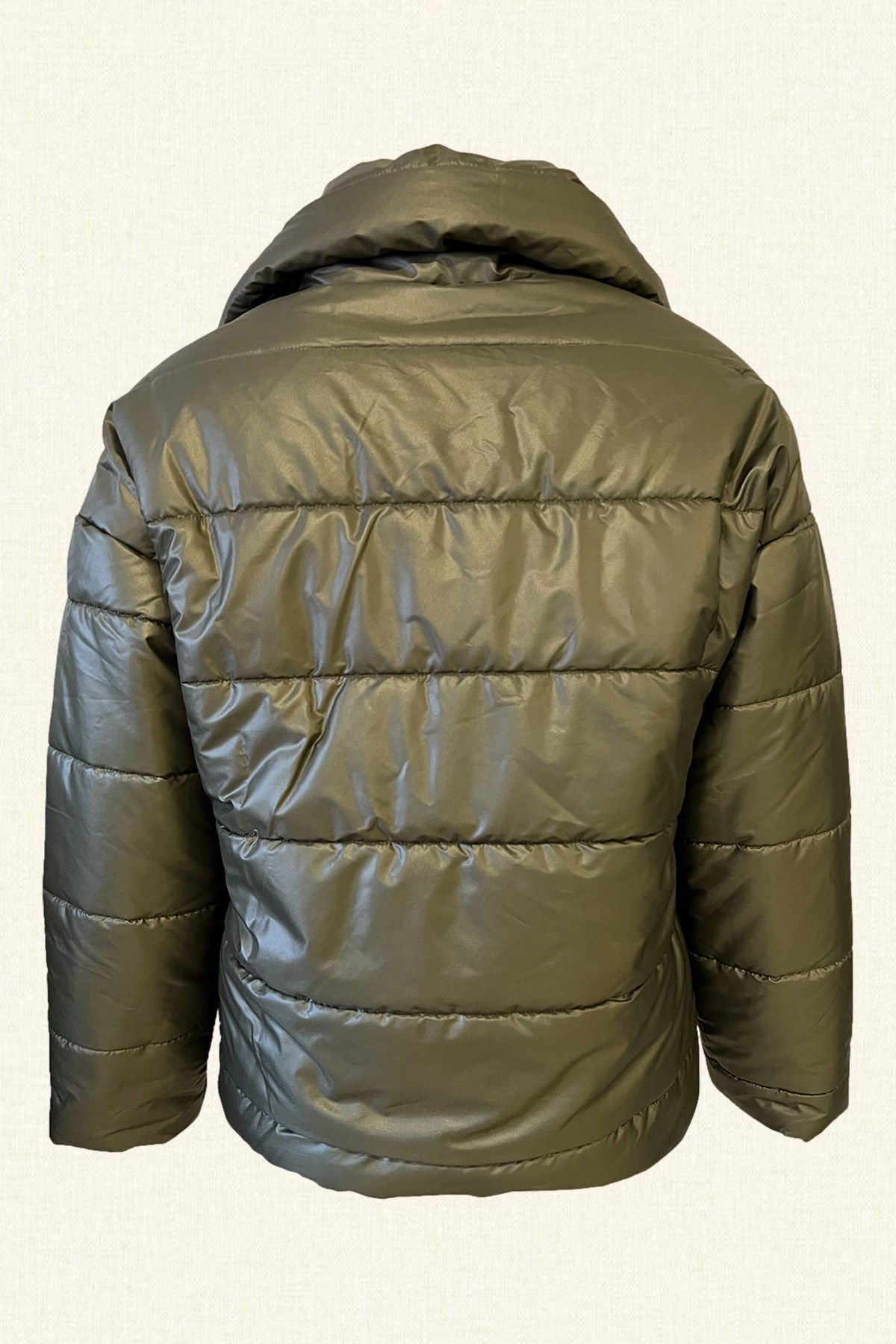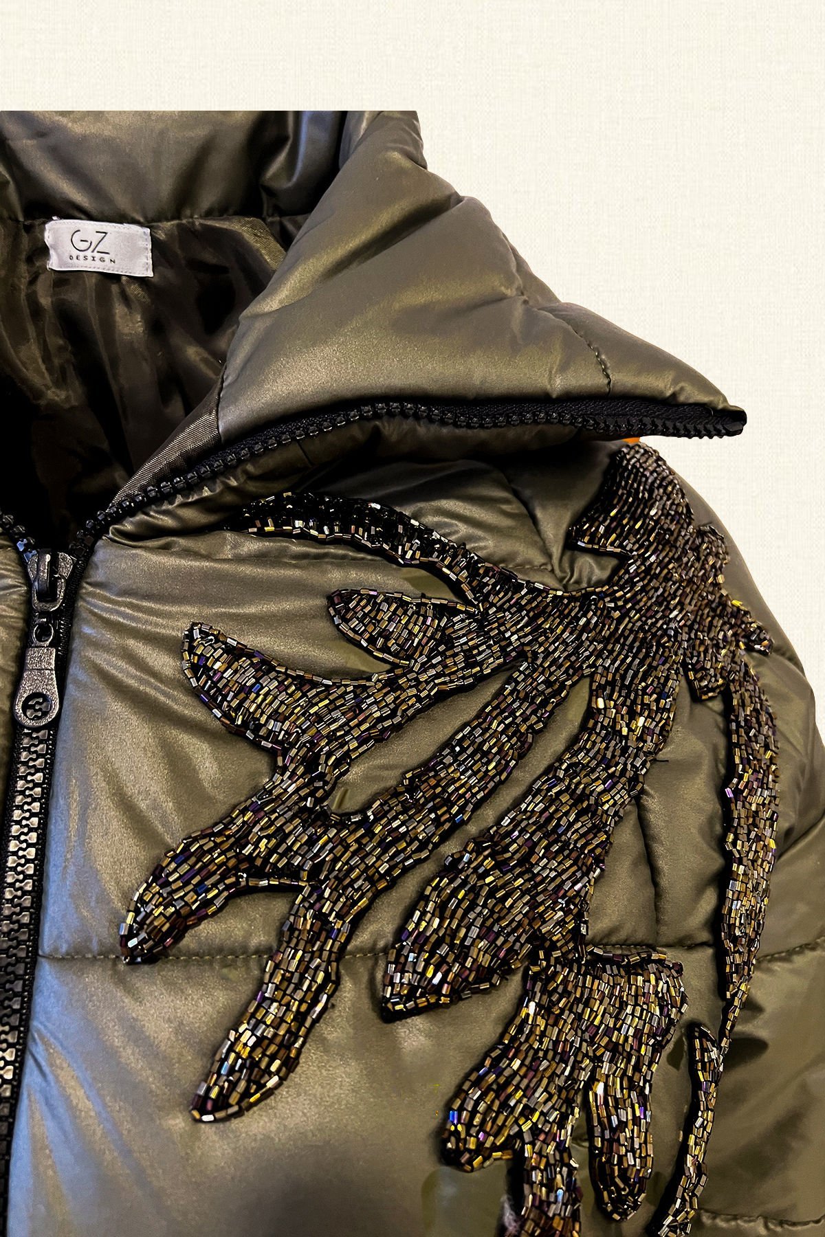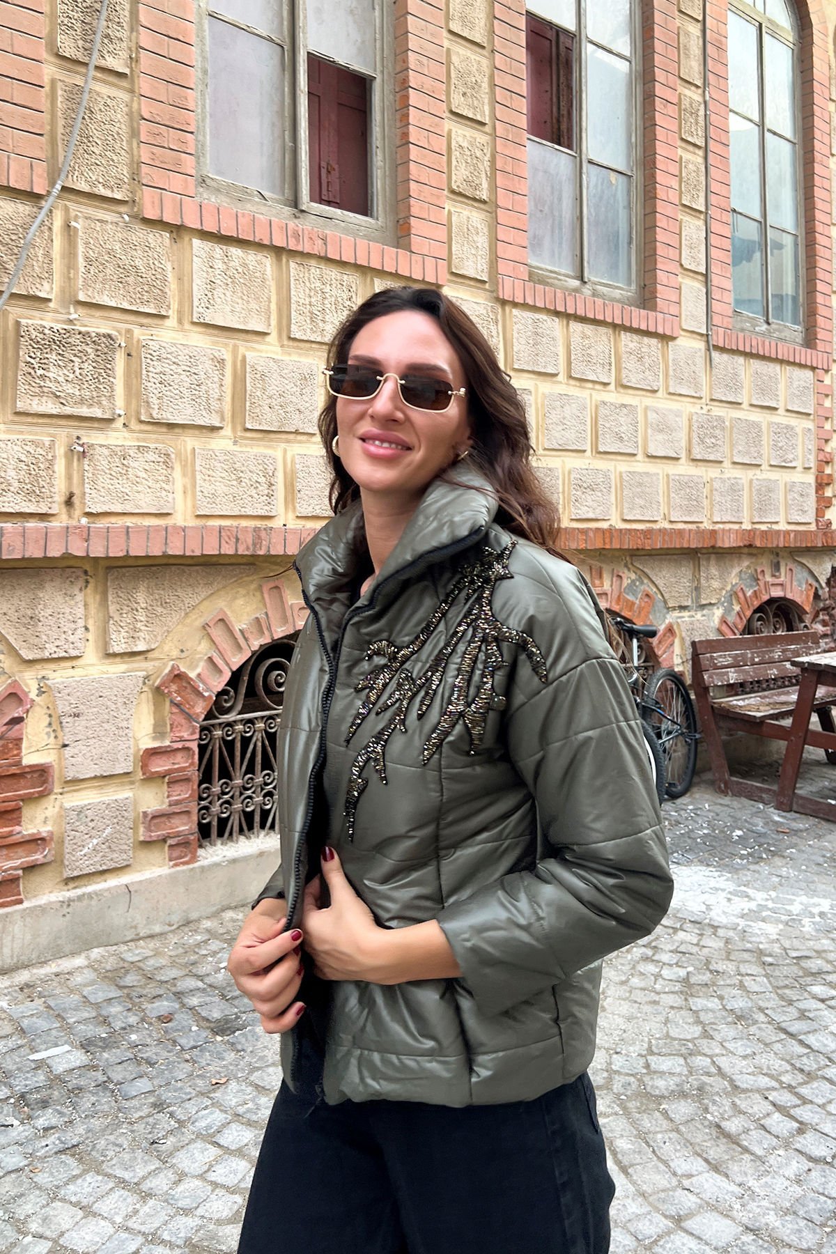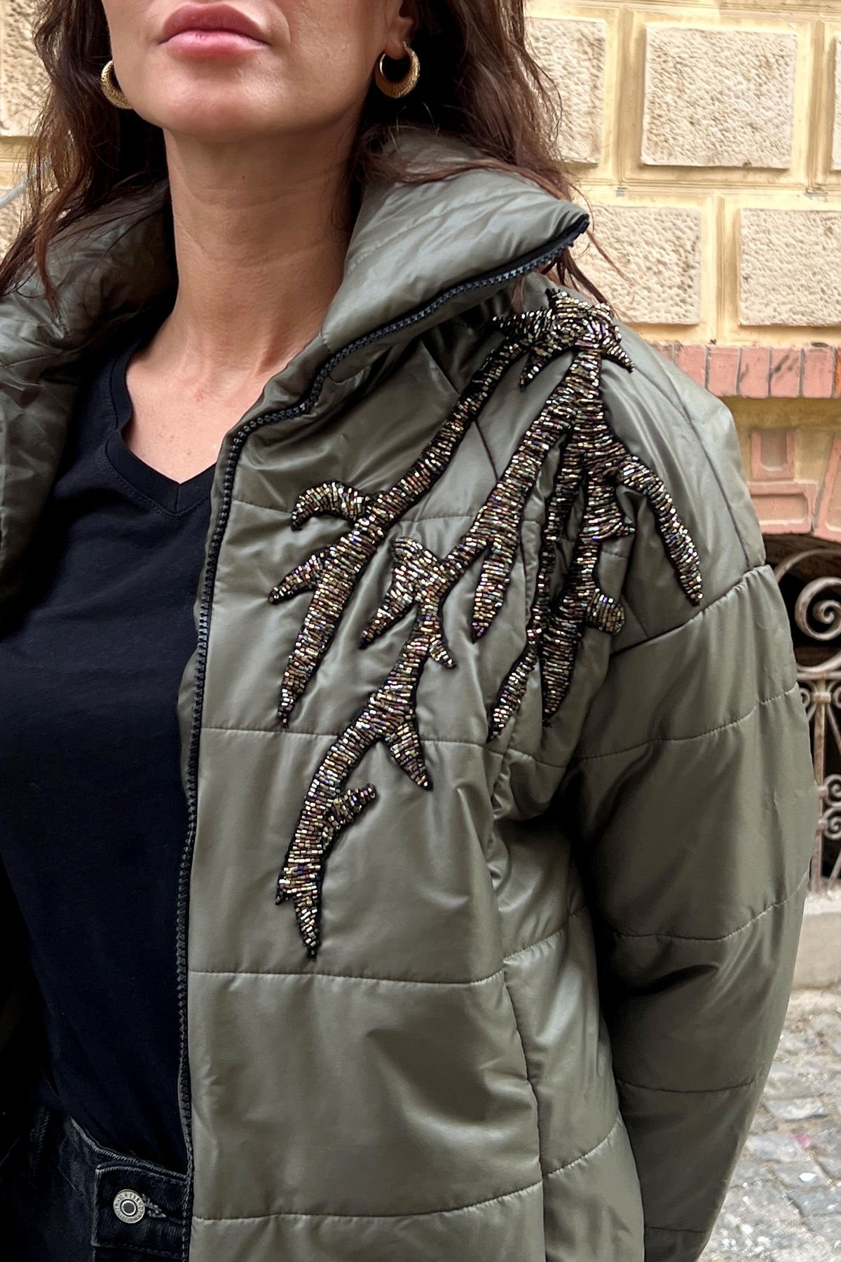 Yakasında kristal boncuk işlemeli dal detaylı asker yeşili şişme mont.