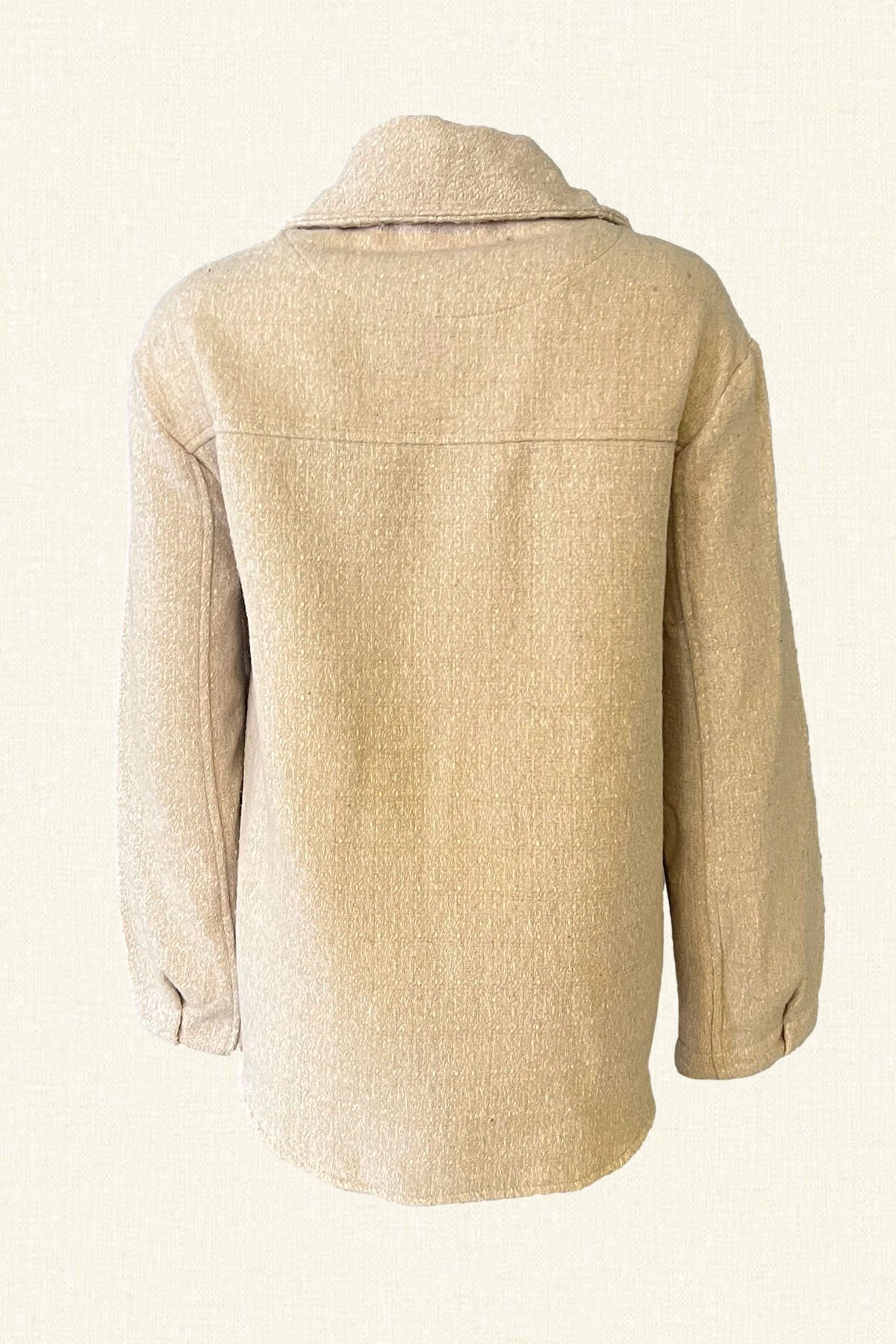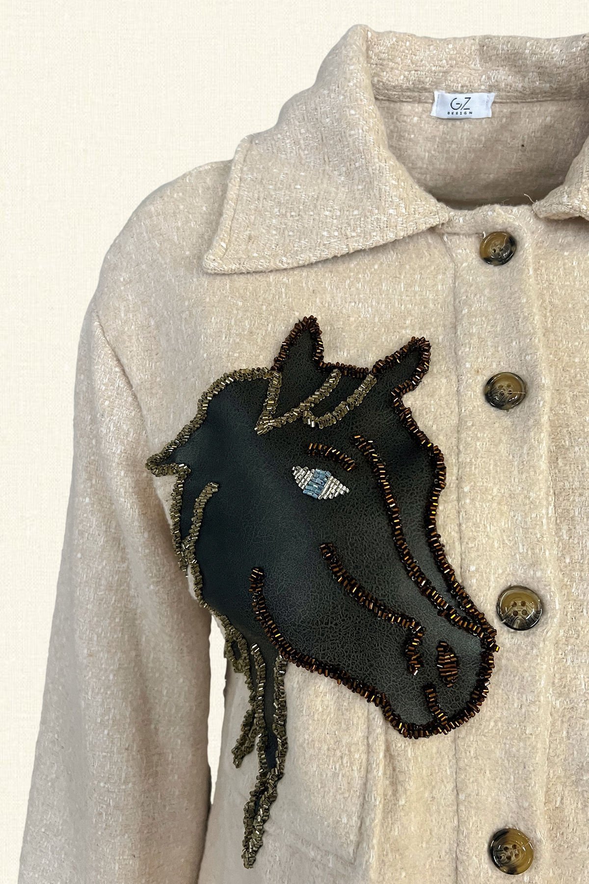 Ön kısmında kristal boncuklardan deri üzerine at figürü işlemesi bulunan, ahşap düğmeli, krem renk oversize yün ceket.